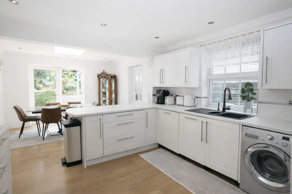 The contemporary kitchen/dining room has been thoughtfully designed with both style and practicality in mind. Offering ample workspace and dining area, it is perfectly suited for modern living—whether hosting guests or enjoying everyday family life.