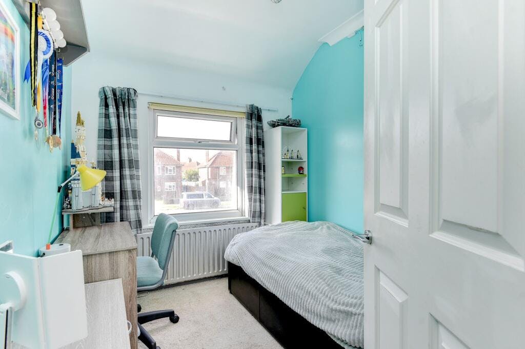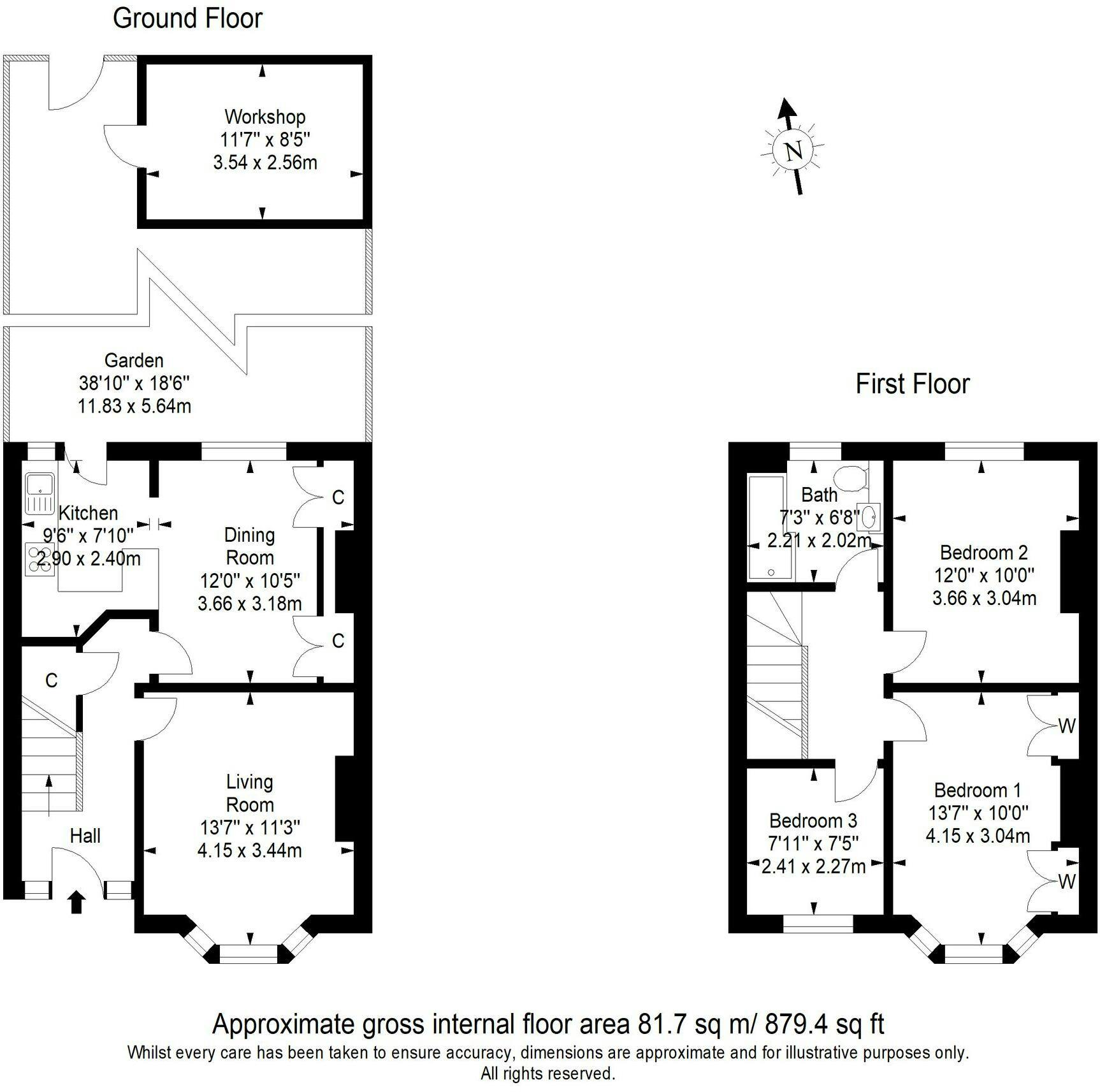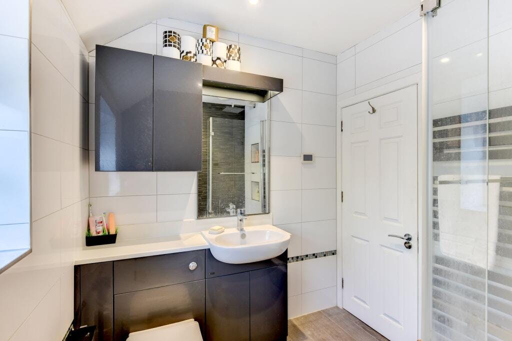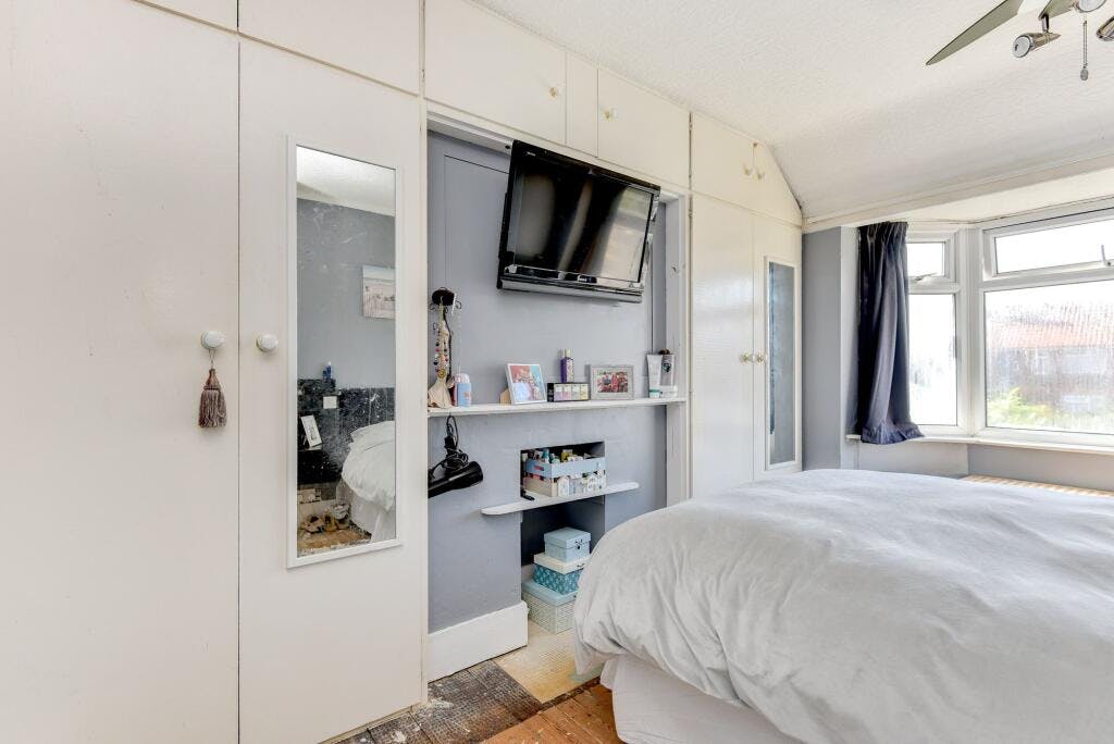 The main bedroom is South facing and has built-in storage. The second bedroom overlooks the leafy back garden, and the third is again South facing.