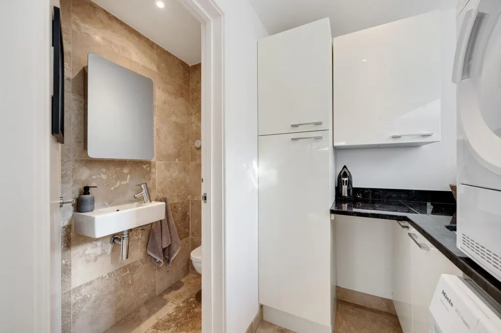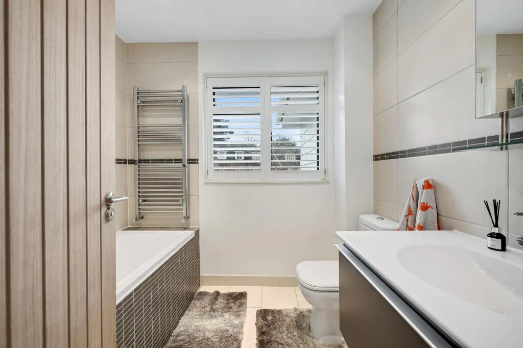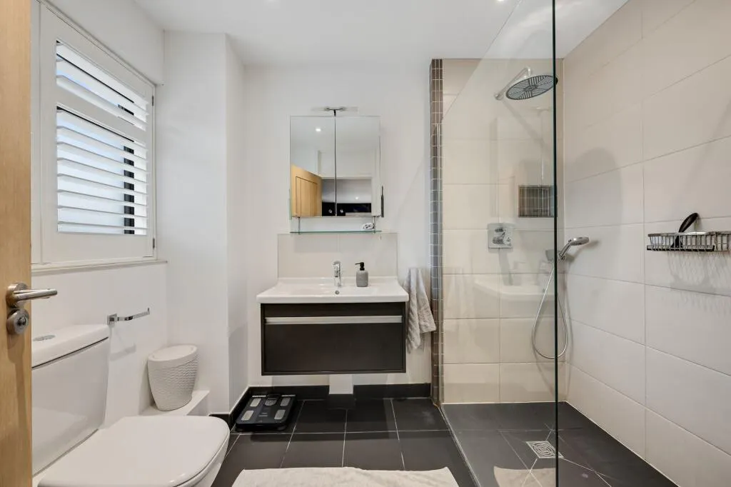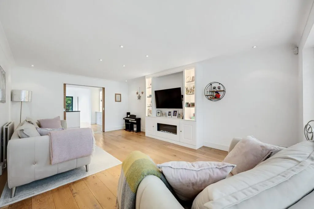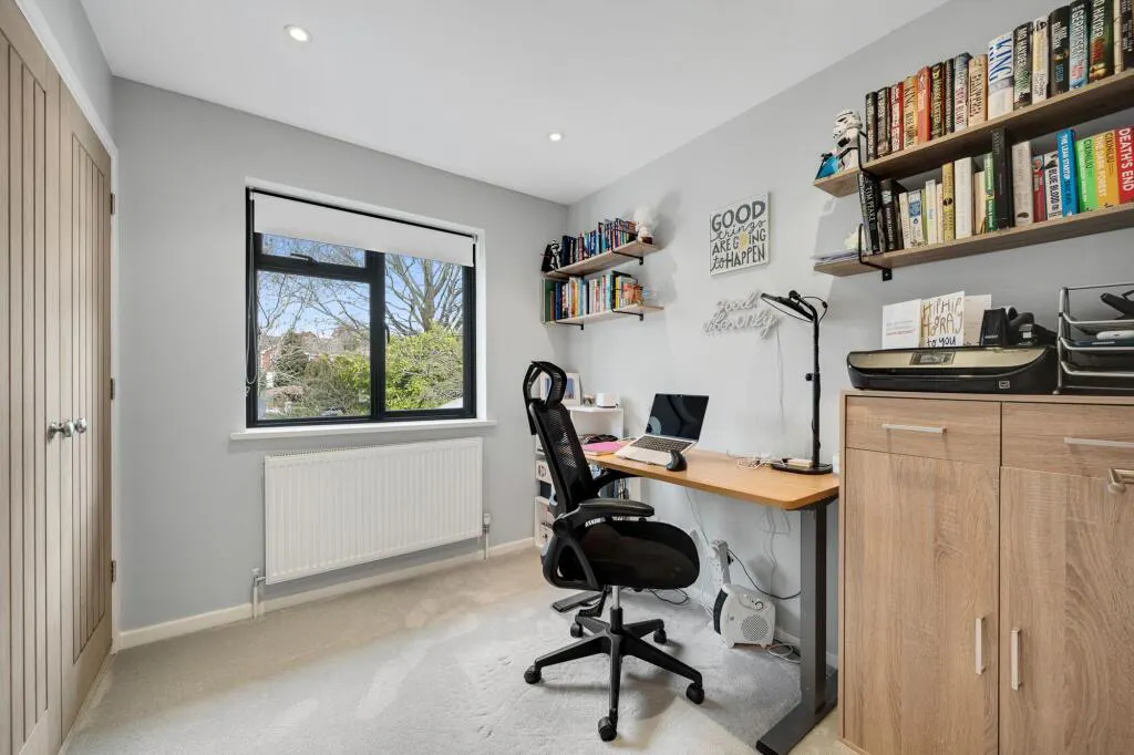 To the rear, the property boasts a beautifully maintained 55’ private garden, featuring a patio area ideal for summer BBQs and entertaining, a well-kept lawn, and a variety of mature shrubs and planting. There is also ample space to incorporate a garden office, studio, or gym, if desired.