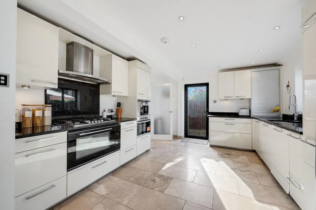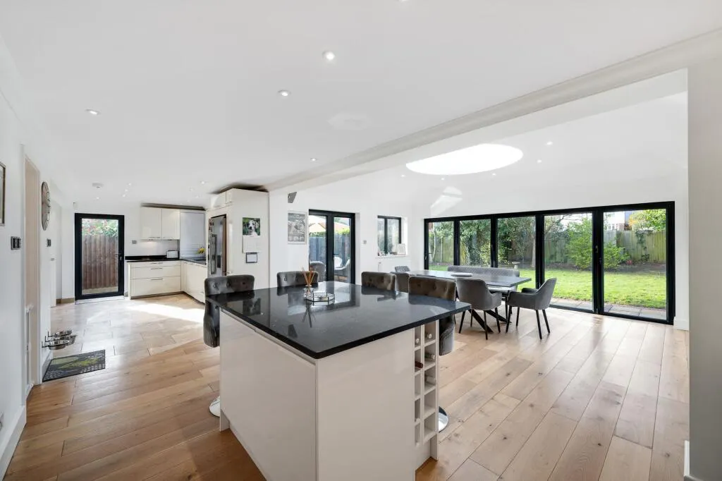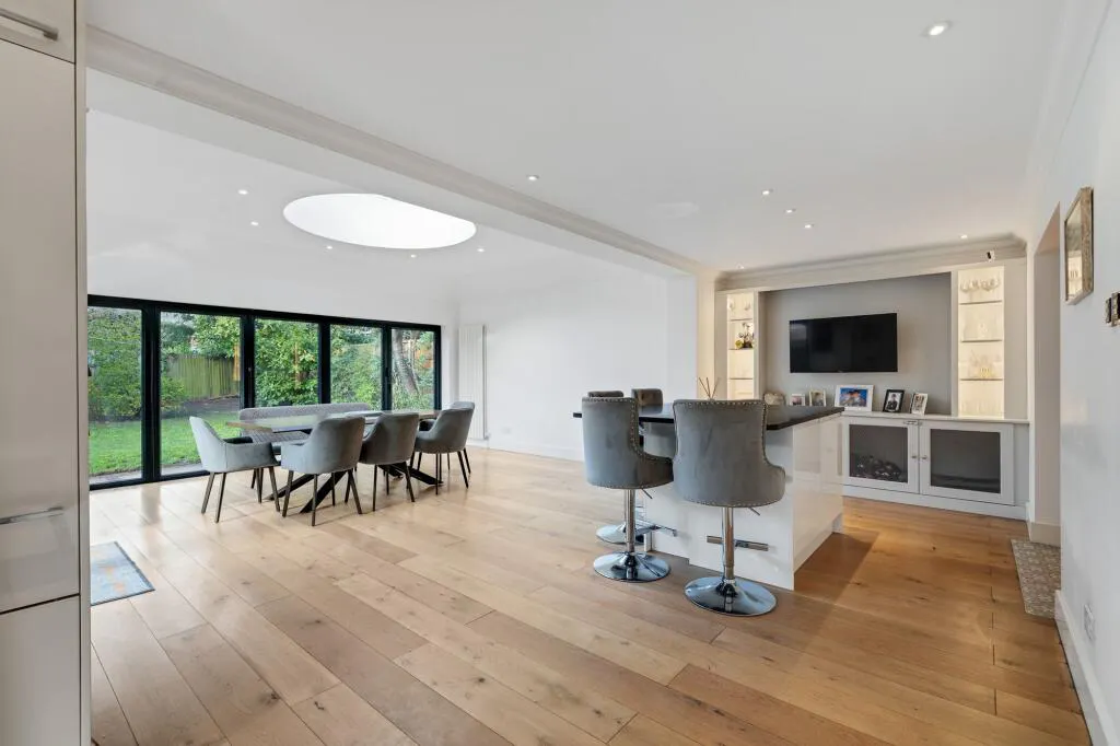 Accommodation comprises entrance hall with inbuilt storage, leading into the front aspect reception room with modern feature fireplace, with bespoke media cabinet and ample space for entertaining and relaxing, The breath-taking extended open plan kitchen/diner/family room is flooded with natural light from large orangery style skylight windows and bi-folding doors spilling out onto the garden – perfect for al fresco entertaining! – with excellent space for formal and informal gatherings. The kitchen area comprises a range of quality fitted high gloss wall and base units with central island and quartz work surfaces, incorporating inset sink unit, new gas hob with overhead extractor and oven below, as well as a range of new appliances including a microwave and dishwasher. A separate utility room with adjacent guest WC offers additional work and appliance space.