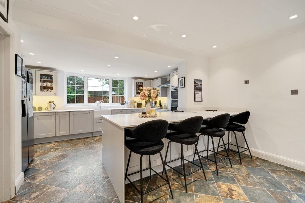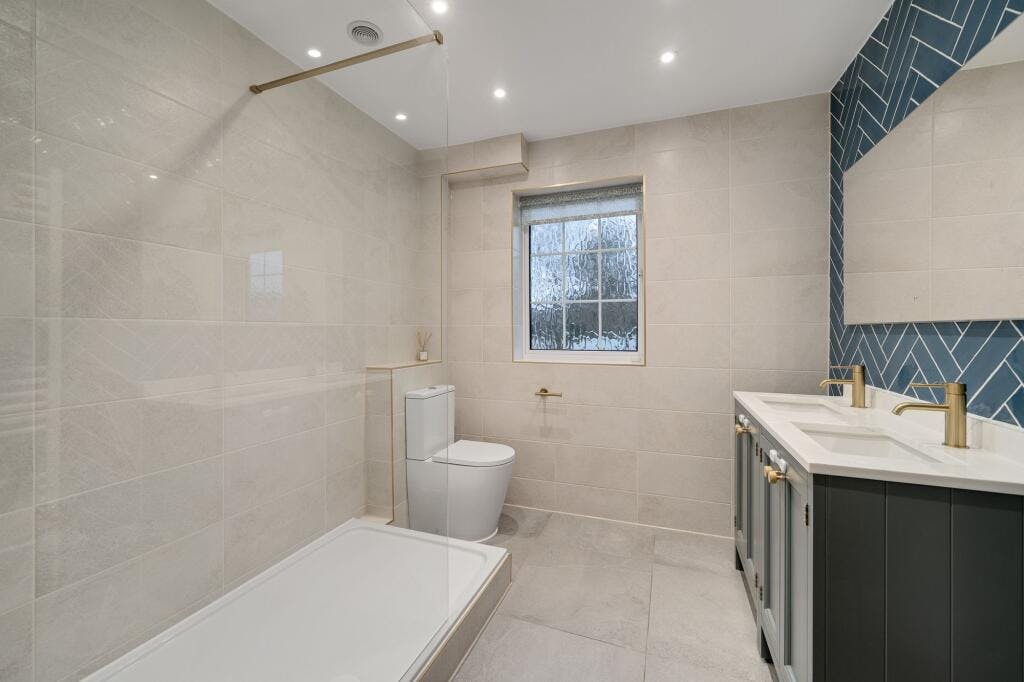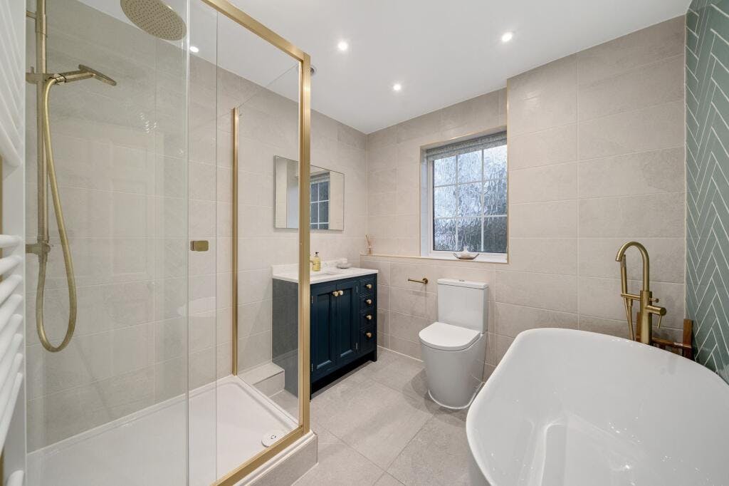 To the first floor are five well-proportioned bedrooms, with the three larger bedrooms benefiting from air conditioning. The principal bedroom is served by an en-suite shower room, while a beautifully appointed family bathroom with free-standing bath and walk-in shower serves the remaining bedrooms.