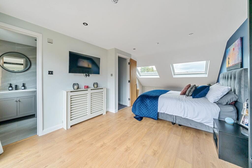 Accommodation comprises entrance porch and hallway with access to guest WC and stairs rising to the first floor, leading into a double length through reception room with attractive front aspect bay, modern feature fireplace, double doors to the rear onto the garden, and ample space for relaxing, entertaining and dining. The separate kitchen, extended to the rear with door onto the garden, comprises a high quality range of matching wall and base units, with work surfaces incorporating inset sink unit, electric hob with overhead extractor and oven below, and further space for appliances. To the first floor, there are three well proportioned bedrooms – two doubles and a single/study - plus a luxurious family bathroom with modern bath suite and separate walk-in shower unit. The second floor provides a large principal bedroom suite with stylish shower room, Juliette style balcony and access to useful remaining eaves space.