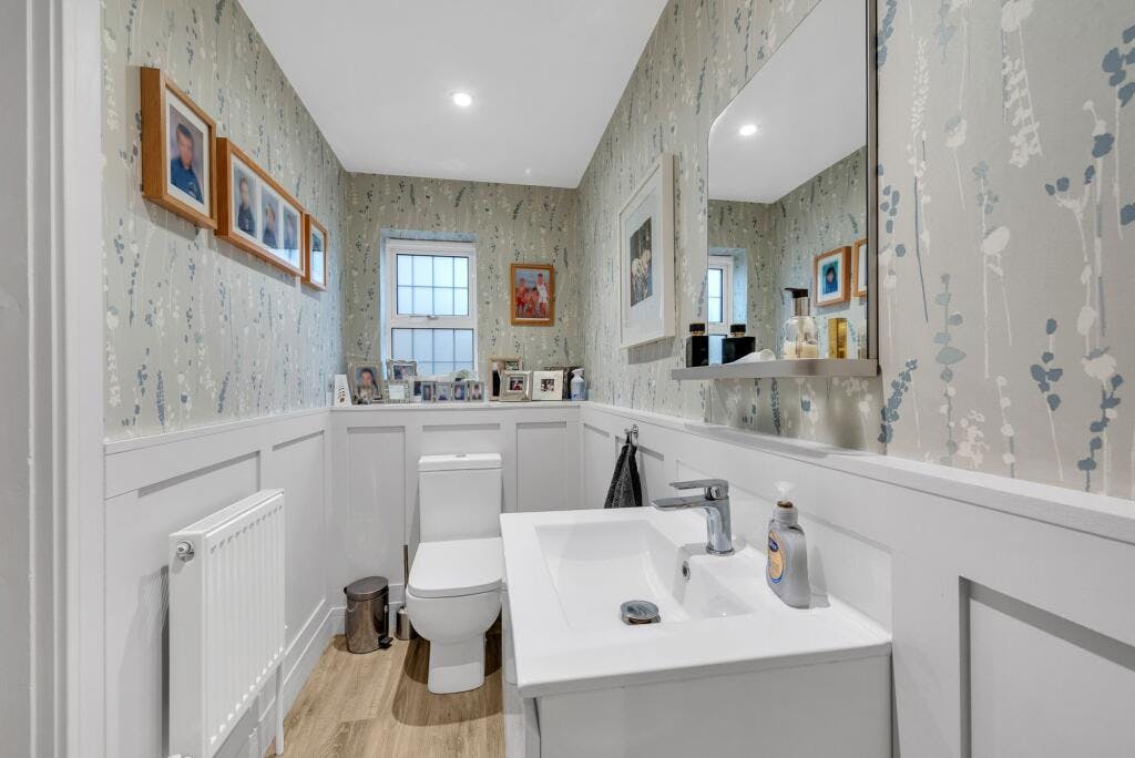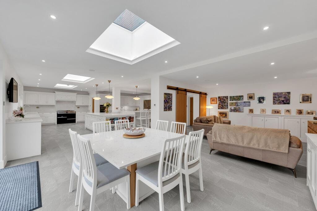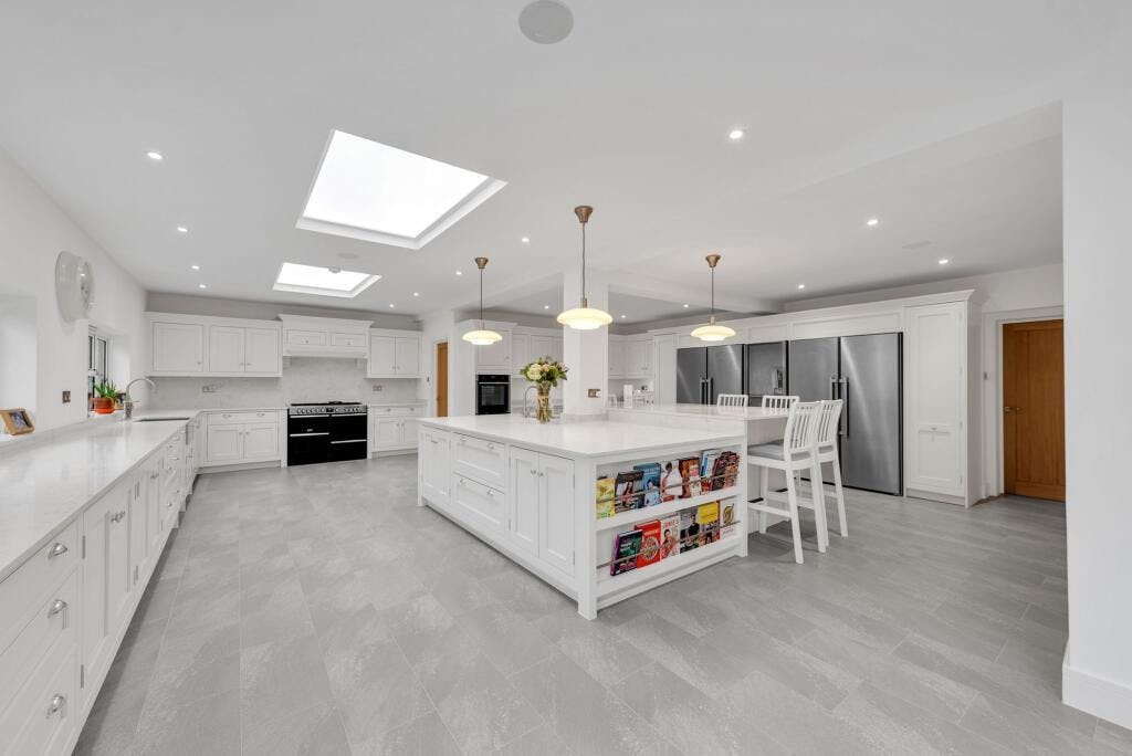 Accommodation comprises large central entrance hall accessed via a charming covered veranda, with turning staircase rising through first and second floors, with glass domed ceiling flooding the property with natural light. The dual aspect double length reception room provides a peaceful place for relaxing and entertaining, whilst the impressive open plan kitchen/diner/family room to the rear offers a captivating space for social occasions – both rooms fitted with surround sound and Cambridge integrated speaker system. With bi--folding doors spilling out onto the external patio area and garden beyond, and overhead skylight windows, the wonderful rear aspect room is truly the heart of the home, with fantastic space for all the family – as well as being the perfect area for formal and informal gatherings. The kitchen area comprises a quality range of bespoke hand painted fitted wall and base units with quartz work surfaces and large central island/breakfast bar, incorporating inset sink unit, ‘Stoves’ Bluetooth range cooker, ‘NEFF’ Bluetooth oven, integrated dishwasher and inbuilt microwave, two ‘Liebherr’ stainless steel fridge freezers and steel glass fronted wine cooler. A separate utility room offers additional work surfaces and appliance space.