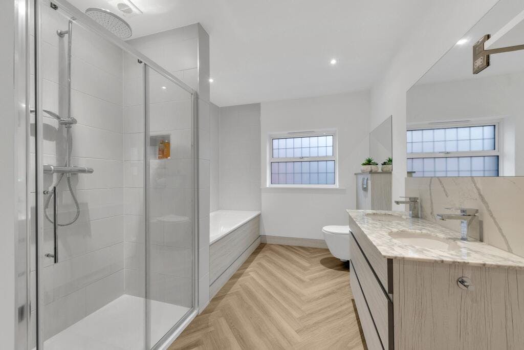 To the first floor, there are four large double bedrooms – three with luxury en-suite facilities and fully fitted dressing areas – and a beautiful family bathroom with modern bath suite and separate shower unit.