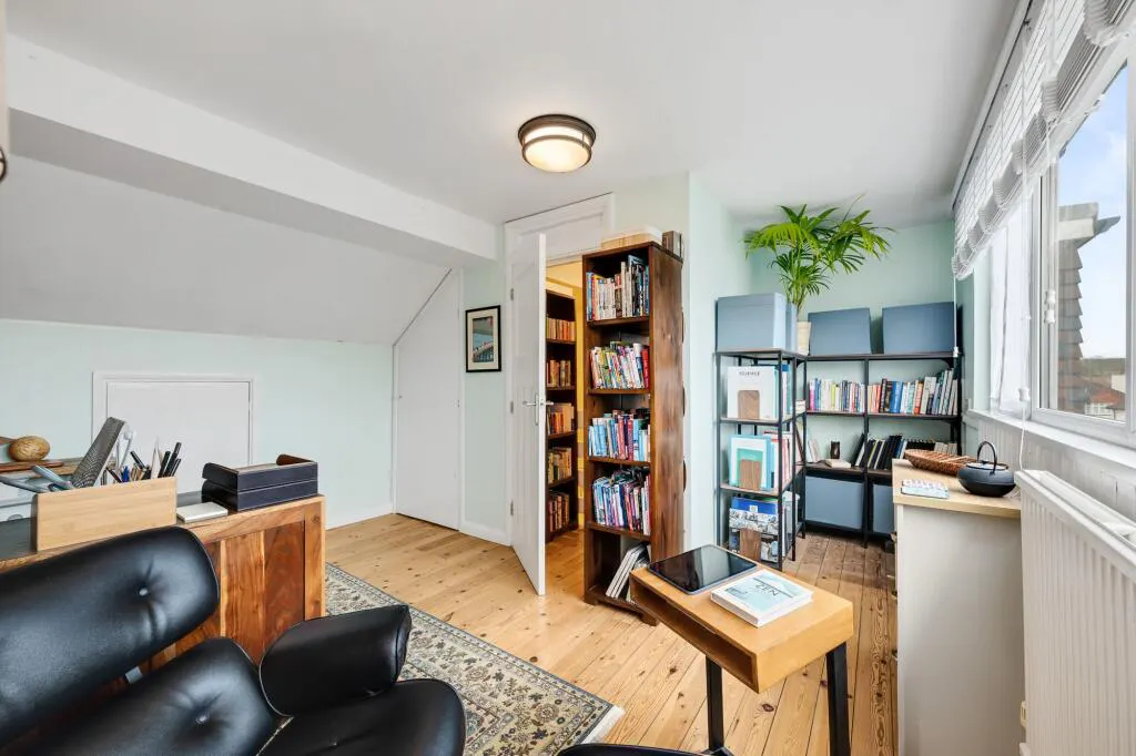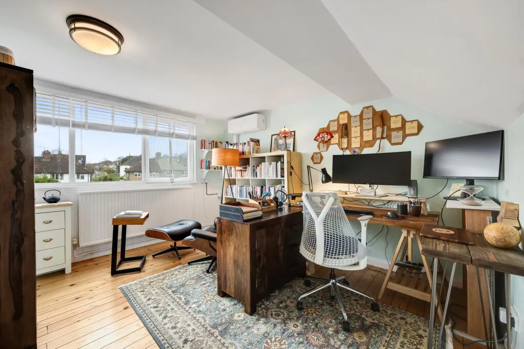 The versatile layout includes a bright and airy reception room, four well-proportioned bedrooms, and two stylish bathrooms, providing ample accommodation for a growing family or those seeking flexible living arrangements. The fourth bedroom, situated in the loft, benefits from the comfort of air conditioning (also installed in the kitchen), ensuring a pleasant environment throughout the year.