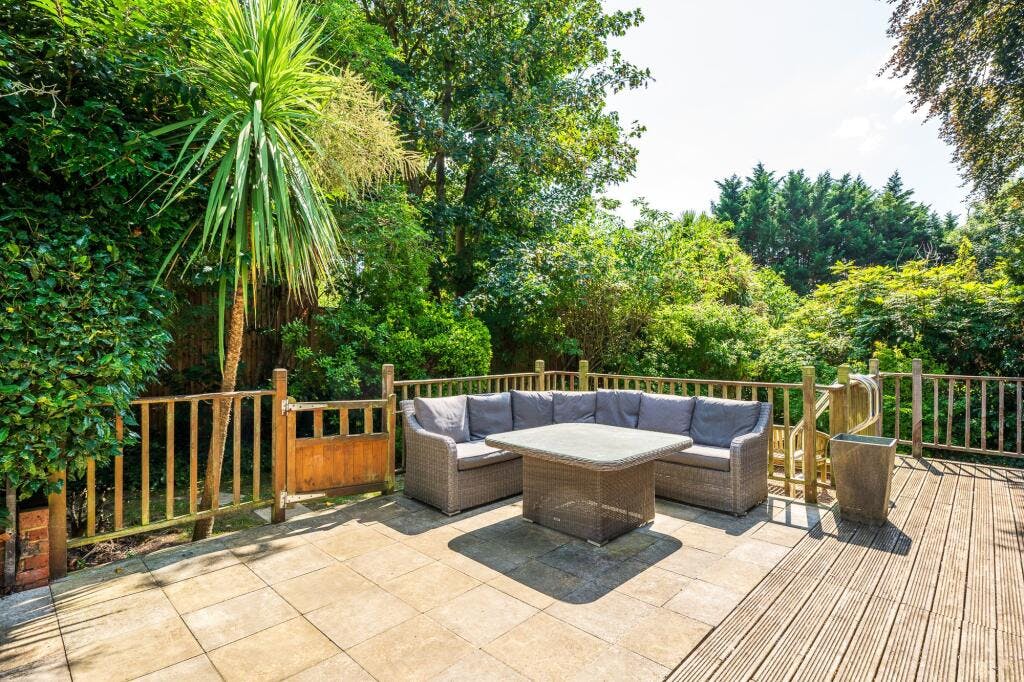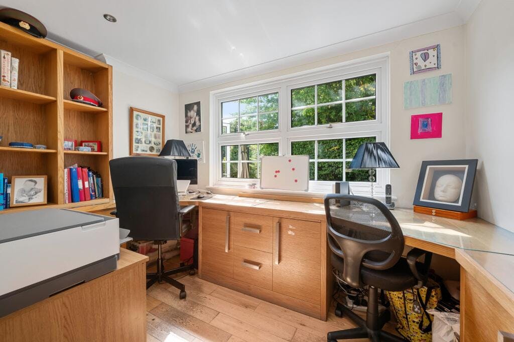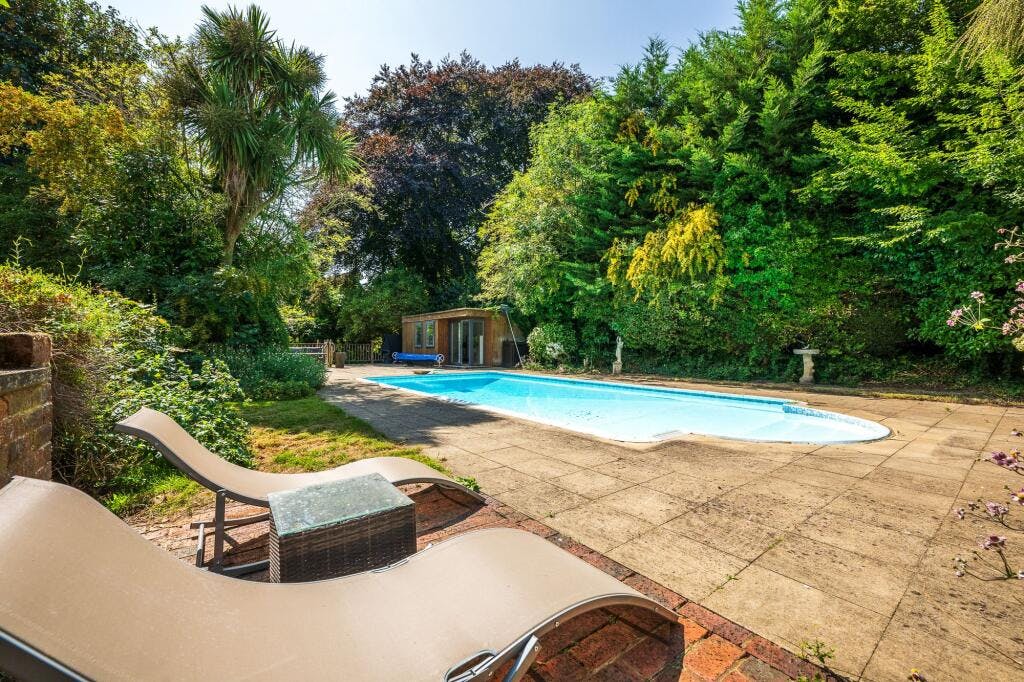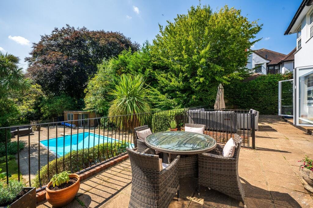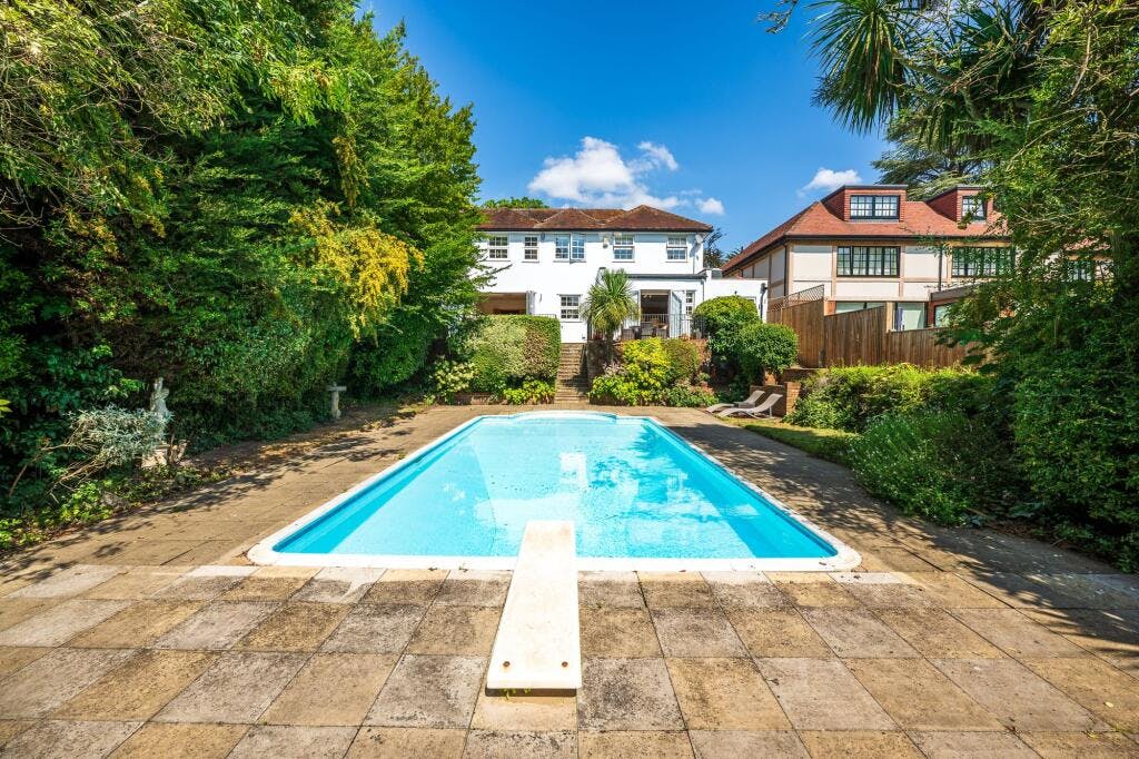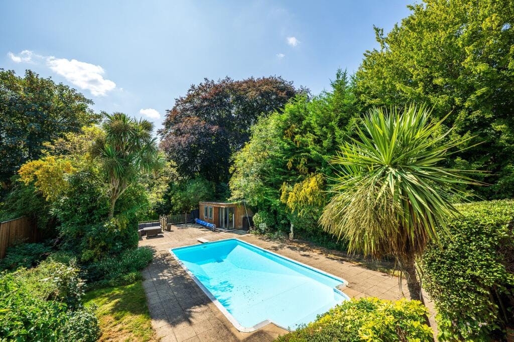 Externally, the 213’ southerly facing garden is thoughtfully arranged over three levels. A raised terrace provides an ideal entertaining space, steps lead down to a private pool area with a detached gym/games room, and beyond lies a large lawn bordered by mature planting – perfect for children to play.