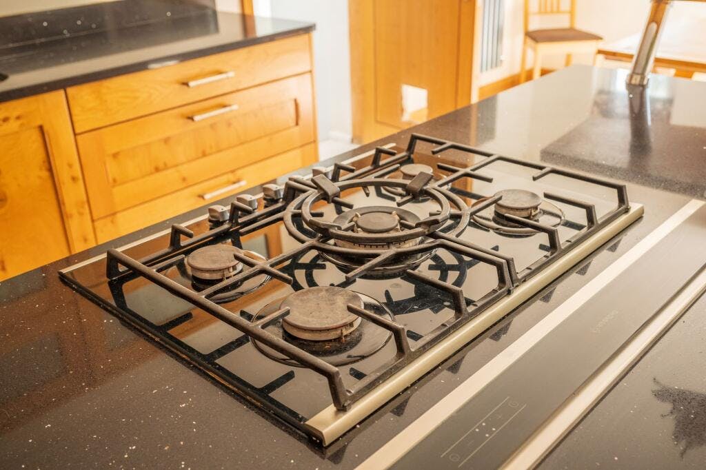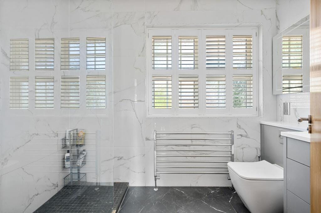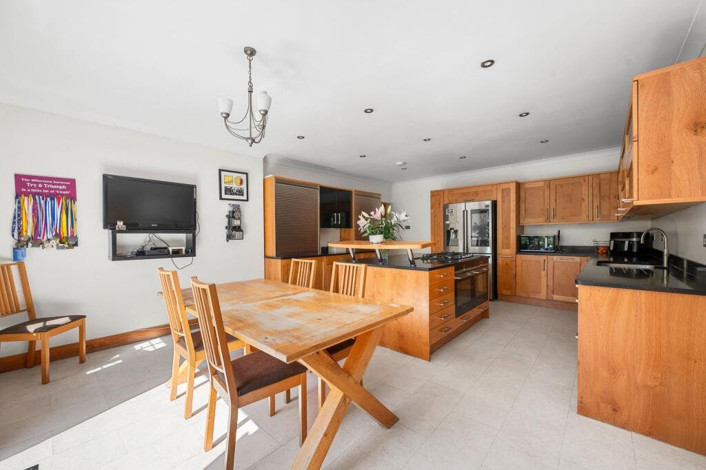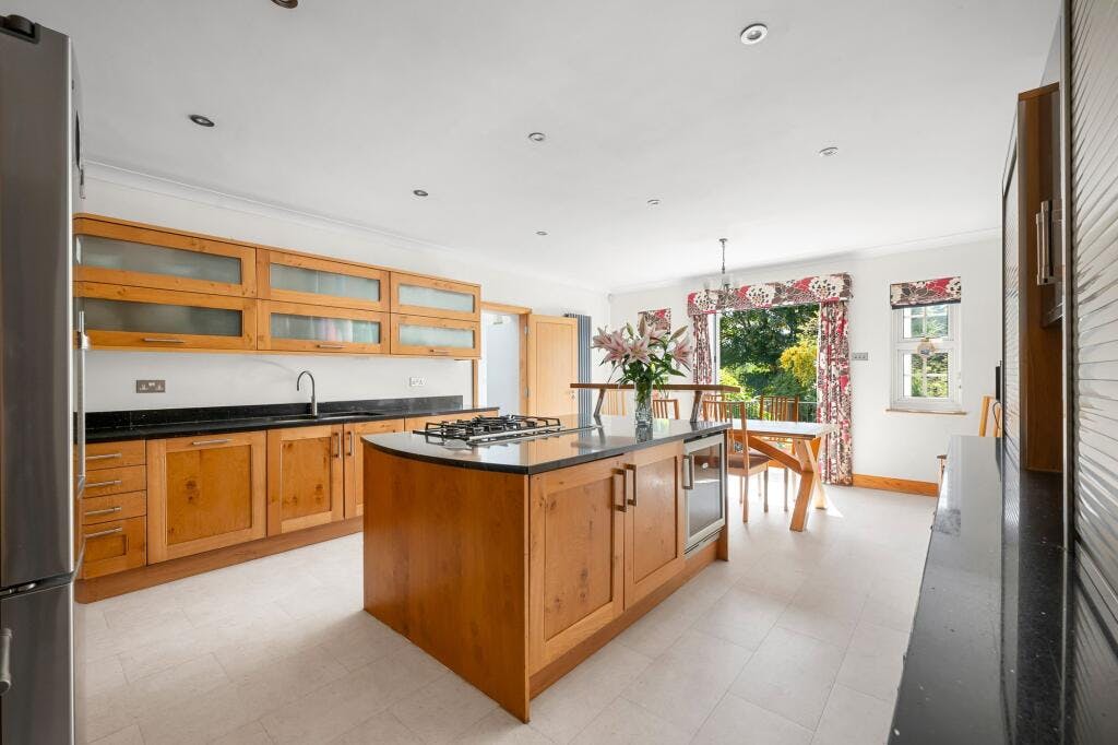 The kitchen/breakfast room, fitted with a modern range of units and a central island, flows seamlessly onto the terrace via French doors. A large utility room offers excellent storage, side access to both front and rear of the property, and even a bespoke dog shower.