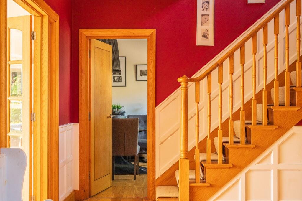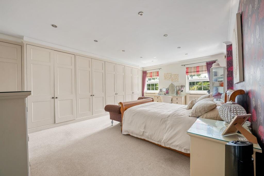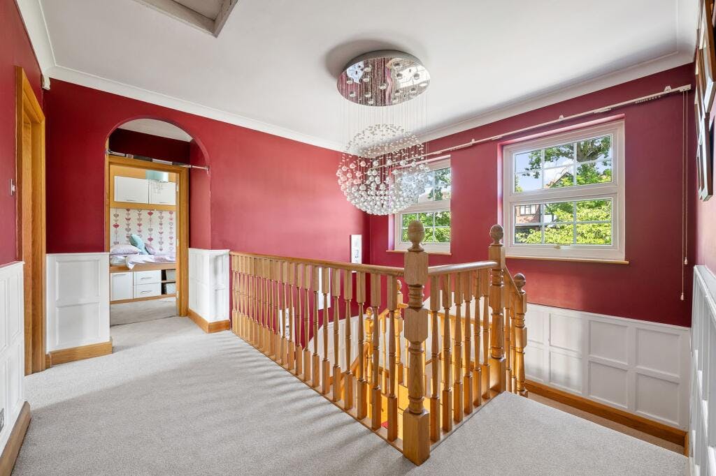 Upstairs, the galleried landing leads to the principal suite – a superbly appointed bedroom with extensive fitted wardrobes and a luxurious en-suite featuring a freestanding bath, double shower, and twin basins. Four further well-proportioned bedrooms, all with fitted wardrobes, are served by a spacious family shower room.