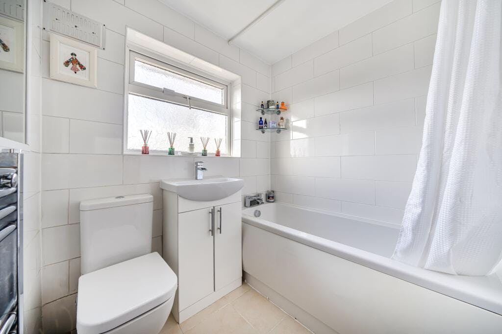 The contemporary family bathroom is finished to a high standard with stylish fixtures and fittings.