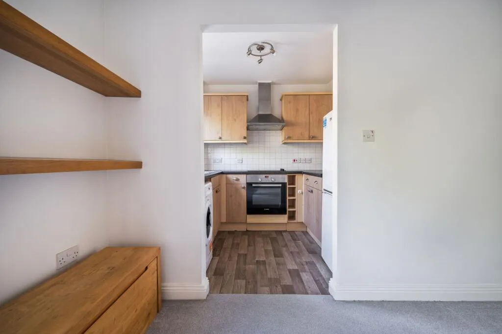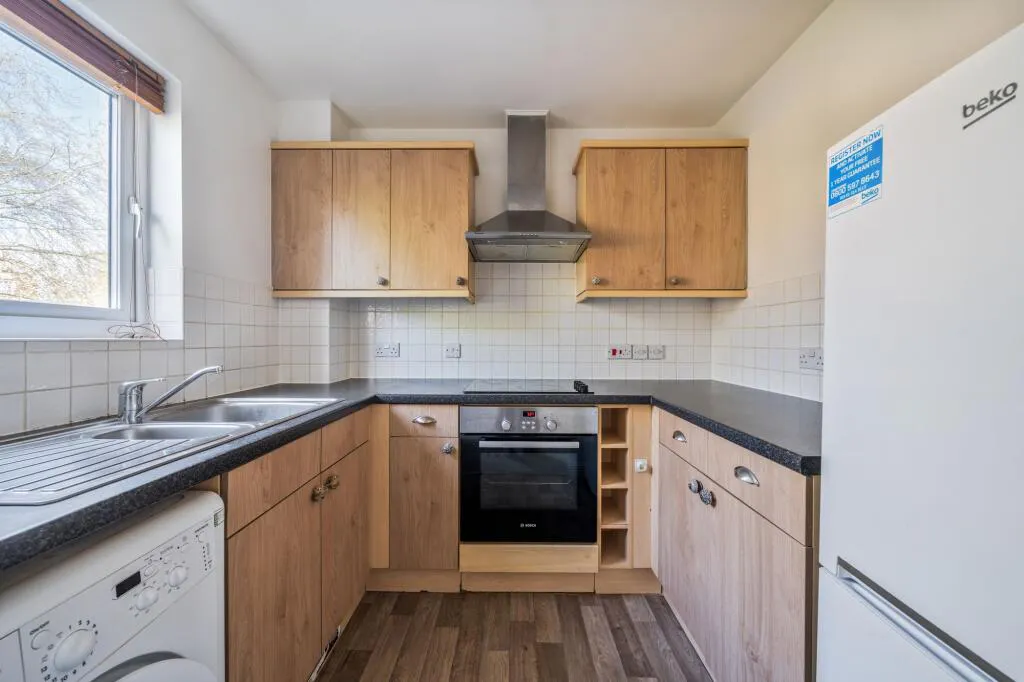 The adjoining kitchen is well appointed, featuring a range of fitted wall and base units, granite effect work surfaces, a stainless steel oven and hob with extractor, and space for essential appliances, all complemented by a window allowing for additional natural light.