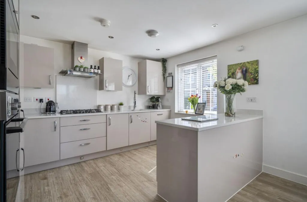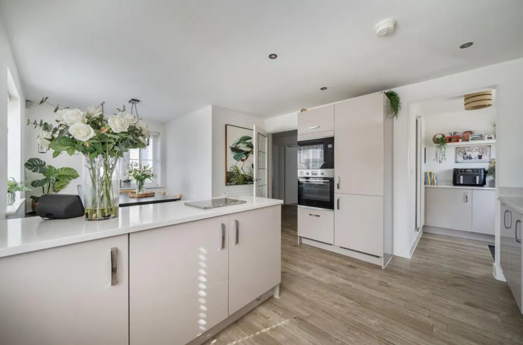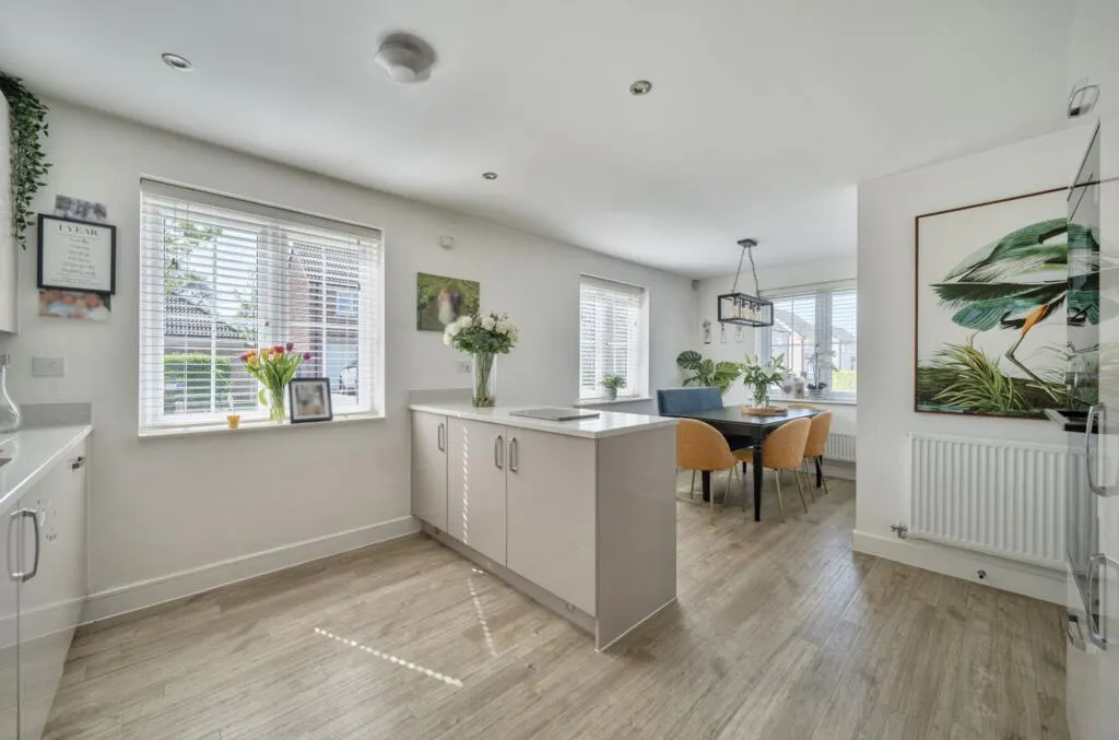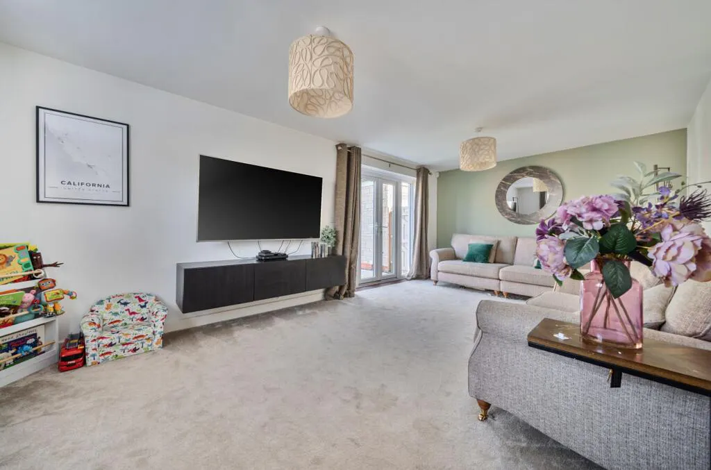 The lounge spans the full depth of the house, with a window to the front and French doors opening directly onto the garden. To the rear is a bright and spacious kitchen diner, forming the heart of the home. Dual aspect windows bring in an abundance of natural light, complemented by a breakfast bar, quartz worktops and fully integrated appliances. There is excellent storage and generous space for dining, making it ideal for both everyday living and entertaining.