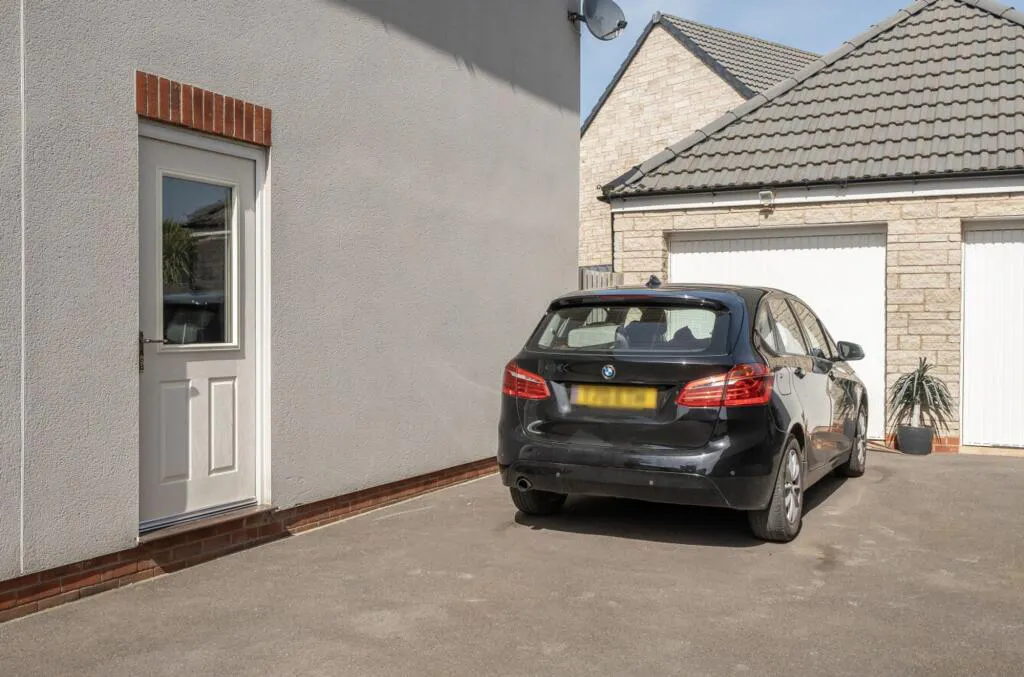 Externally, the property offers strong kerb appeal, with a lawn wrapping from the front to the side, bordered by hedging and a path leading to the covered porch. To the rear, there is parking for three cars, an electric charging point and access to the garage store.
