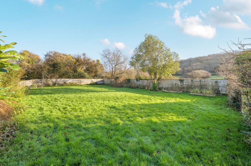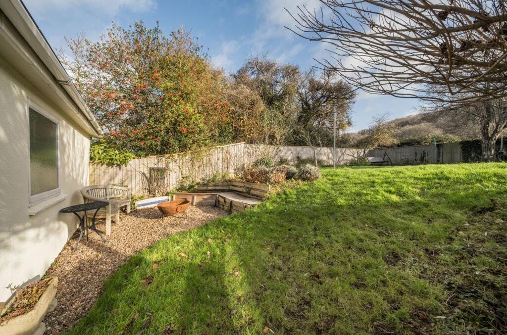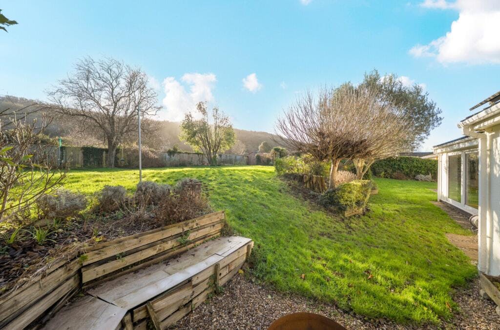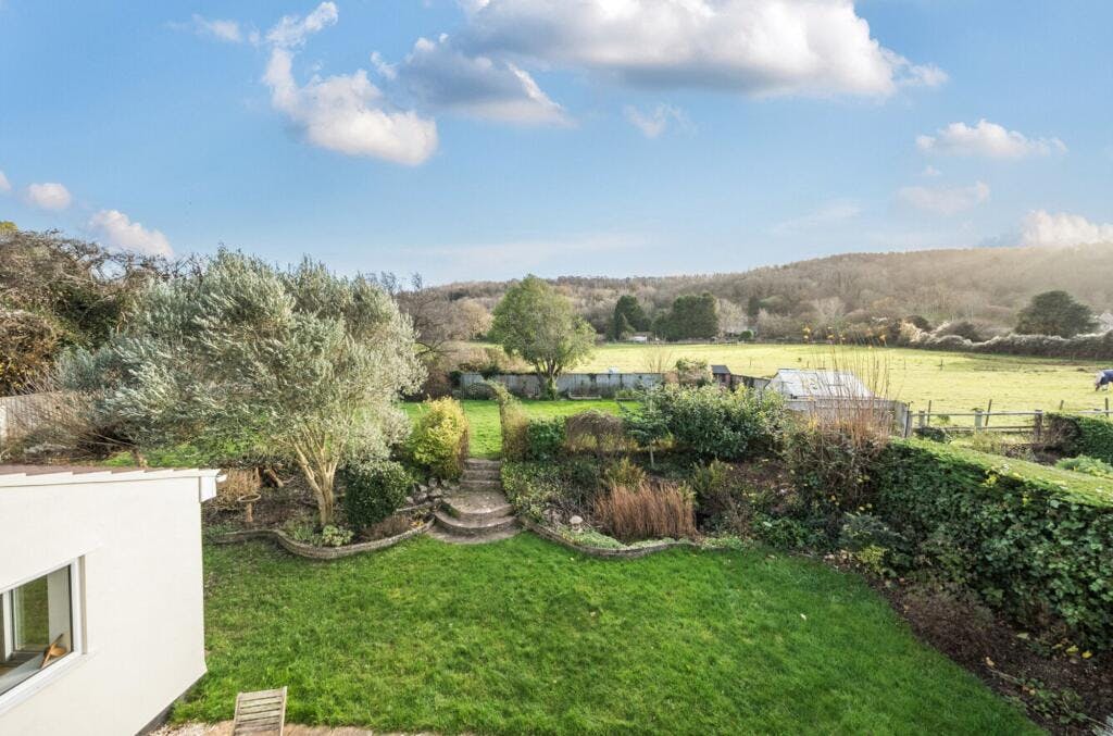 Outside is where this house really comes into its own. The south-east facing garden is larger than most and feels open without being exposed. Patio areas sit directly off the house, alongside a firepit area, with steps leading up to the main lawn. The swing in the tree says a lot about how this space is used. Tucked away behind a hedge are a shed, greenhouse and vegetable patches, and then the real moment, look over the fence and you’re straight into open fields, with horses grazing beyond.