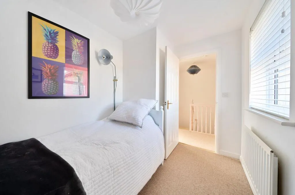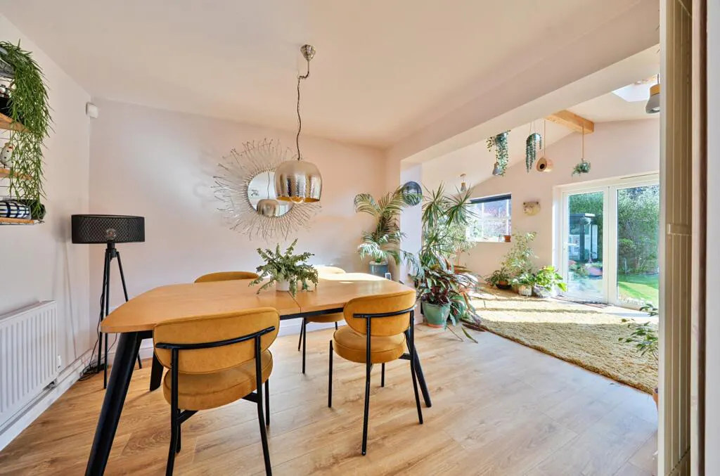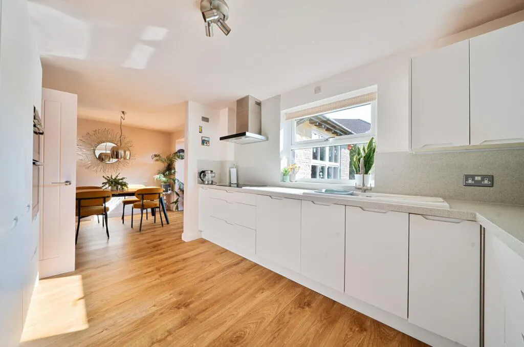To the rear, the house gets even better with a fantastic open-plan kitchen, dining and family space. As you come in, there is space for dining, and to the right a stylish kitchen with white units, integrated appliances and quartz worktops. The sitting area is a great space with windows on both sides and doors opening onto the garden, along with vaulted ceilings, wooden beams and Velux windows. There is also some really nice contemporary lighting in this room, which works really well in the evenings and adds to the overall feel of the space. It’s a brilliant room and works really well as the main living space. There is also a utility room off the kitchen with side access.