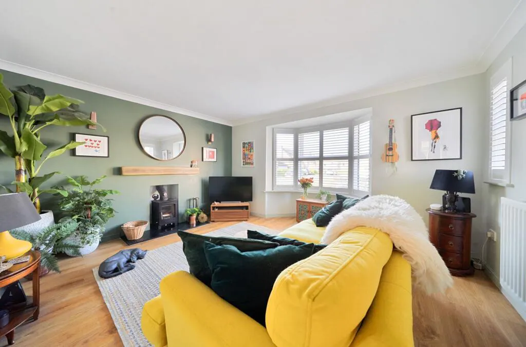 To the front, there is parking, a garage, and a porch with a tiled floor, brick detailing and timber posts. As you walk into the entrance hall, the house really comes to life with colour, storage and a downstairs WC. To the front is a separate lounge, decorated in contemporary colours with a feature wall, dual aspect windows with plantation shutters and a log burner.