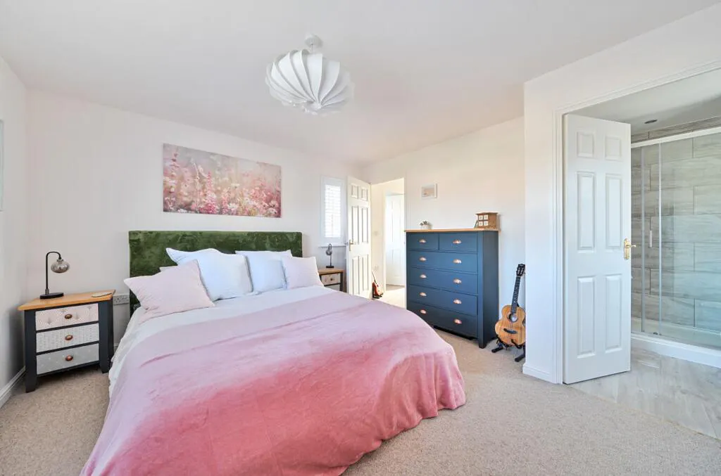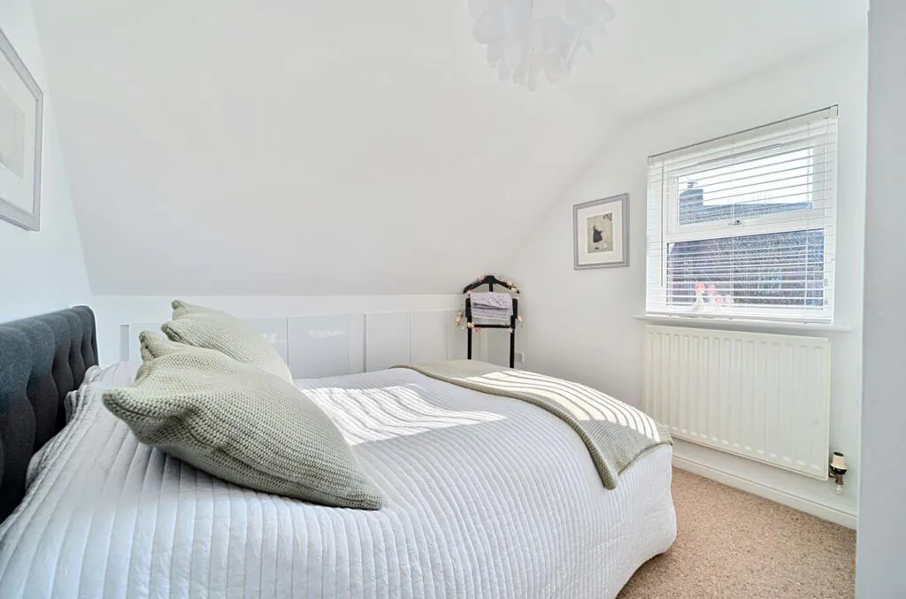 Upstairs, the landing gives access to the first floor, and there is also a storage cupboard housing a hot water tank, which was fitted in the last couple of years. The main bedroom is a really good room with built-in wardrobes along one wall, dual aspect windows with plantation shutters and a well-finished en-suite. There are two further double bedrooms, one with a fitted wardrobe, and a good-sized single bedroom. The current owner has also made very good use of the eaves, creating additional storage. A stylish and well-kept family bathroom completes this floor.