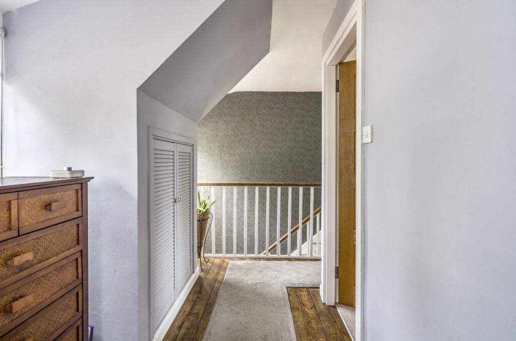 Upstairs, the vaulted ceilings and characterful landing create a wonderful sense of space. To the front is a generous double bedroom with a large bay window, fitted wardrobes, and views over the front garden, with potential to add an en-suite if desired. To the rear are two further double bedrooms, one enjoying lovely views over the garden. There is also useful storage on the landing and a stylish family bathroom with a freestanding bath.