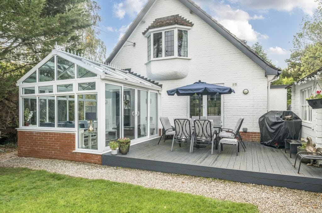 A wonderful conservatory adjoins the kitchen, providing a relaxing space with sofas and garden views, ideal for summer evenings or morning coffee.