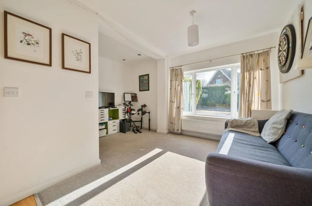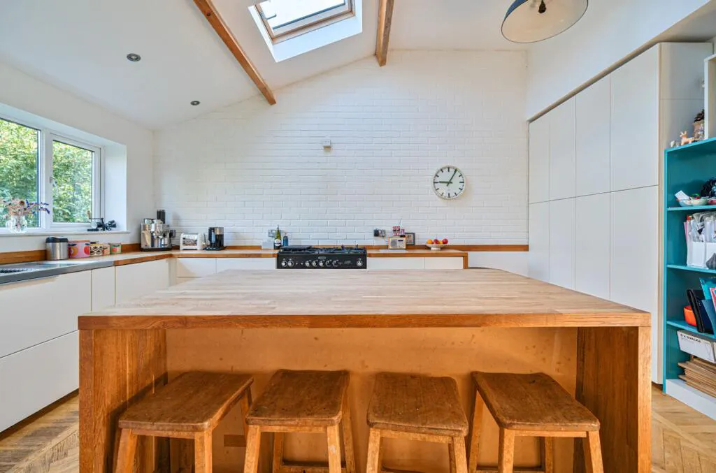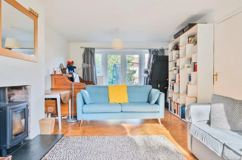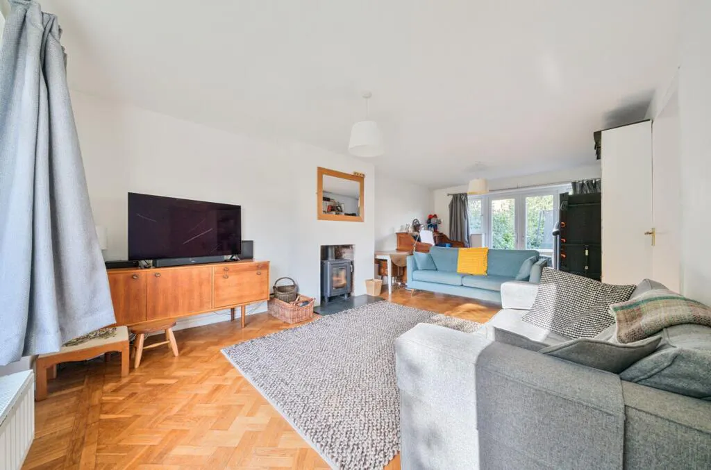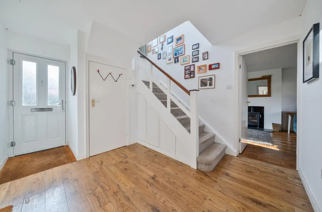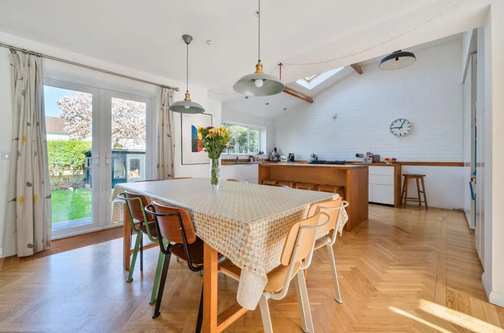The hallway is spacious with excellent storage, and to the left is a light and bright dual aspect lounge that spans from the front to the back of the house. With herringbone flooring, a large window to the front, French doors opening onto the garden and a log burner, it is a really attractive main living space that works well in both summer and winter.