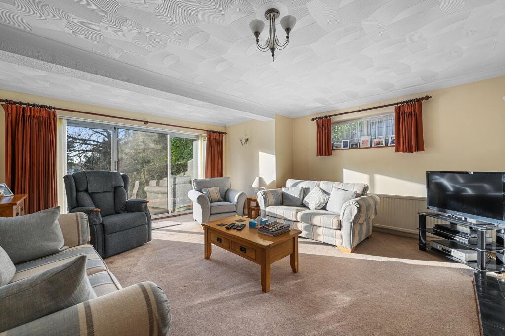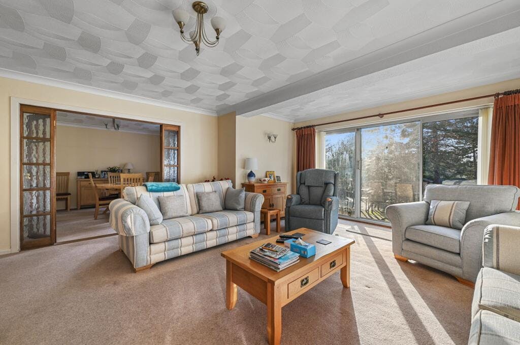 Offset from the kitchen is the formal dining room offering a delightful aspect overlooking the splendid grounds. Entered via glass panelled double doors, the generous sized main reception room, again to rear aspect, includes a gas fireplace with brick surround as well as attractive sliding doors opening on to the garden.