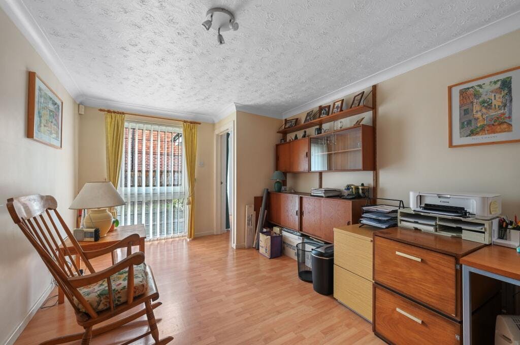 There is also a further living room currently used as a useful home office/study, the neutral décor complimenting the wood laminate flooring. The useful cloakroom has a low-level WC and wash hand basin.