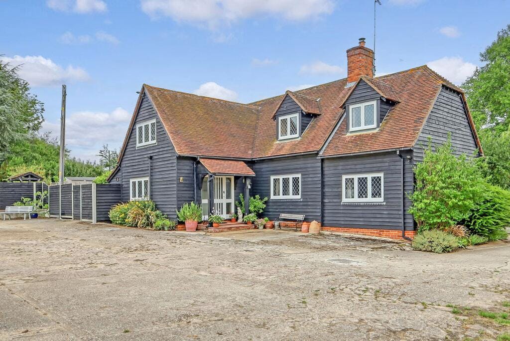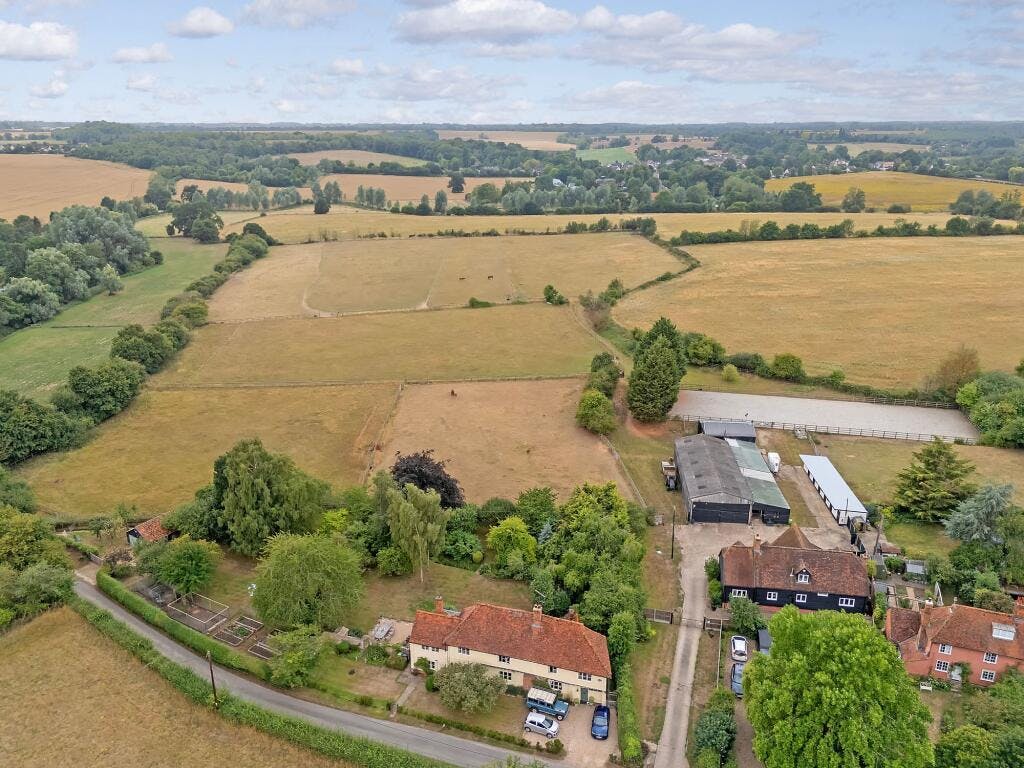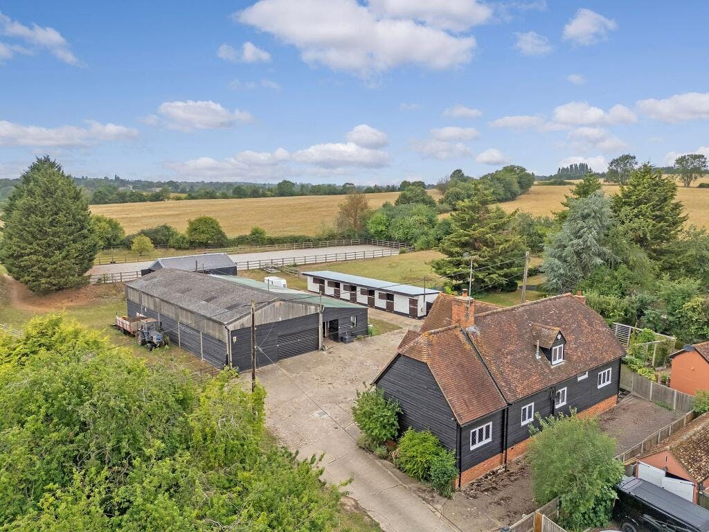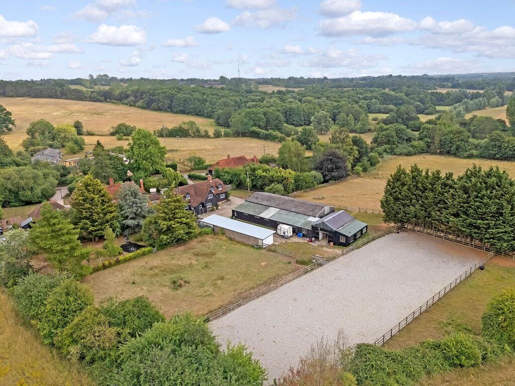 Nestled in the picturesque countryside between Wethersfield and Shalford, this exceptional equestrian property offers a rare opportunity for those looking for something unique and beautiful. Spanning an expansive 14.5 acres (STS), the property includes a detached house, 14 stables, 60m x 20m arena, tack room, feed room, a hay barn and a variety of other garages, workshops and store rooms. The property is located in the beautiful hamlet of Rotten End, approx 5 miles from Braintree and near to the villages of Shalford and Wethersfield. The owners currently run a successful livery business from the property with potential to increase and grow the business further.