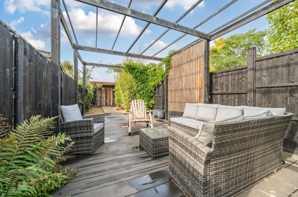 To the rear, a long private garden unfolds in three distinct sections. Flanked by fencing on either side, it feels secure and secluded—ideal for children, pets, or entertaining.
