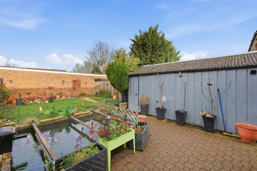 Upstairs, the property provides three double bedrooms, complemented by a versatile loft room that can be used as a home office, hobby space, or converted to a fourth bedroom (STPP). Externally, the home includes a private, unoverlooked rear garden featuring a patio area, lawn, established flower borders, and a large pond. To the front, a detached garage sits behind security gates, with additional driveway parking available for multiple vehicles.
