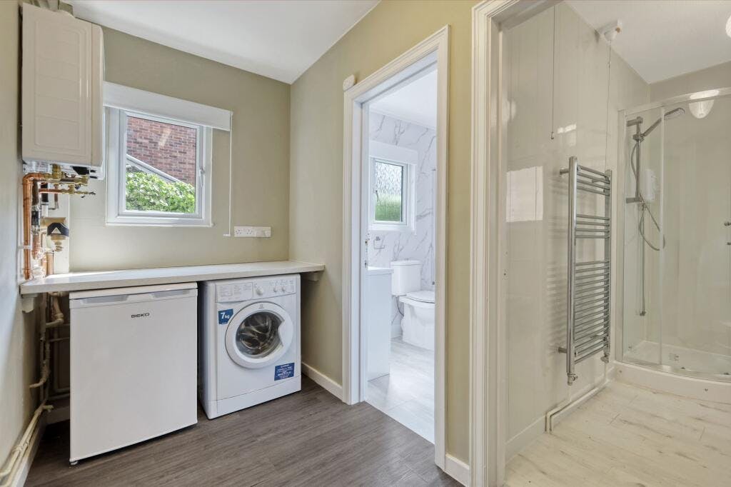 The interior features two large reception rooms, a large and spacious living area with a striking bay window and a separate large dining room ideal for entertaining. The modern kitchen opens into a practical utility area with further doors to the newly fitted bathroom and separate shower room. Upstairs, there are three generously sized bedrooms, all recently refurbished with ample storage/wardrobe space in each.