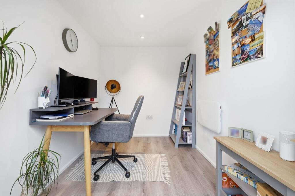 Externally, the property enjoys a good sized west facing rear garden with French doors opening into the home office. To the front, a driveway provides parking for two vehicles and leads to the garage, which retains storage space alongside the converted office area.