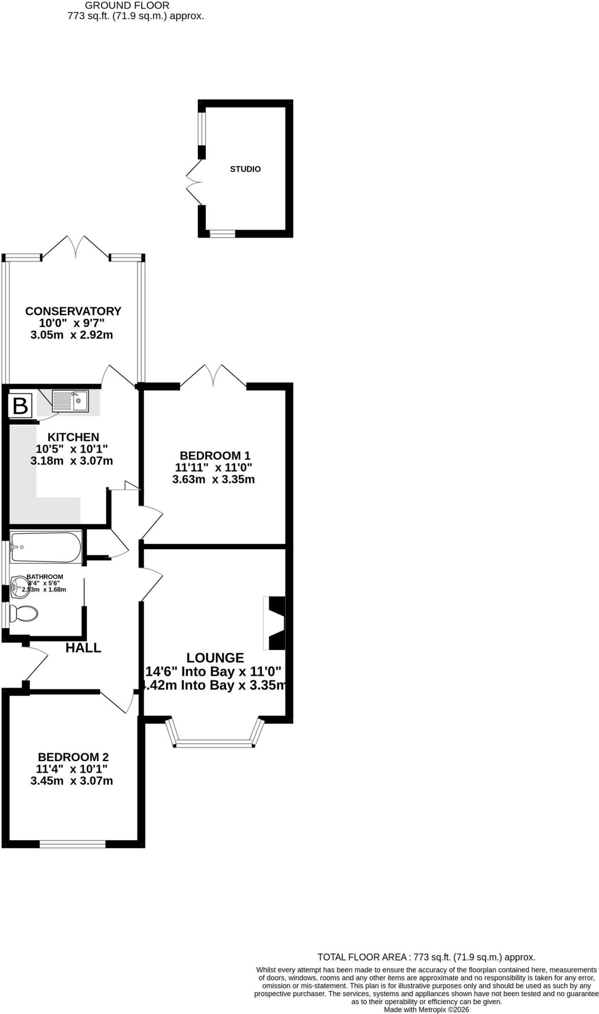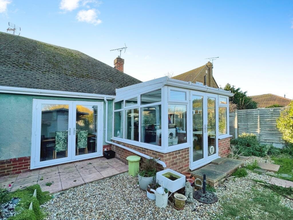 This well-presented two-bedroom semi-detached bungalow offers spacious and flexible accommodation, ideal for those seeking comfortable single-level living. The property comprises a welcoming entrance hall, a bright and airy lounge with ample space for both relaxing and entertaining, and a modern fitted kitchen complete with integrated oven, hob and extractor. A recently constructed double-glazed conservatory provides valuable additional living space and enjoys pleasant views over the rear garden. Both bedrooms are well proportioned, with the principal bedroom offering generous dimensions, while the second bedroom lends itself perfectly as a guest room, home office or dining room. The bathroom is fitted with a contemporary suite, and further benefits include a large loft which is part-boarded and insulated, offering excellent storage and potential for conversion, subject to the usual consents. Externally, the property features off-road parking to the front for two vehicles and a timber-framed, insulated studio with power and lighting, ideal for home working or hobbies.