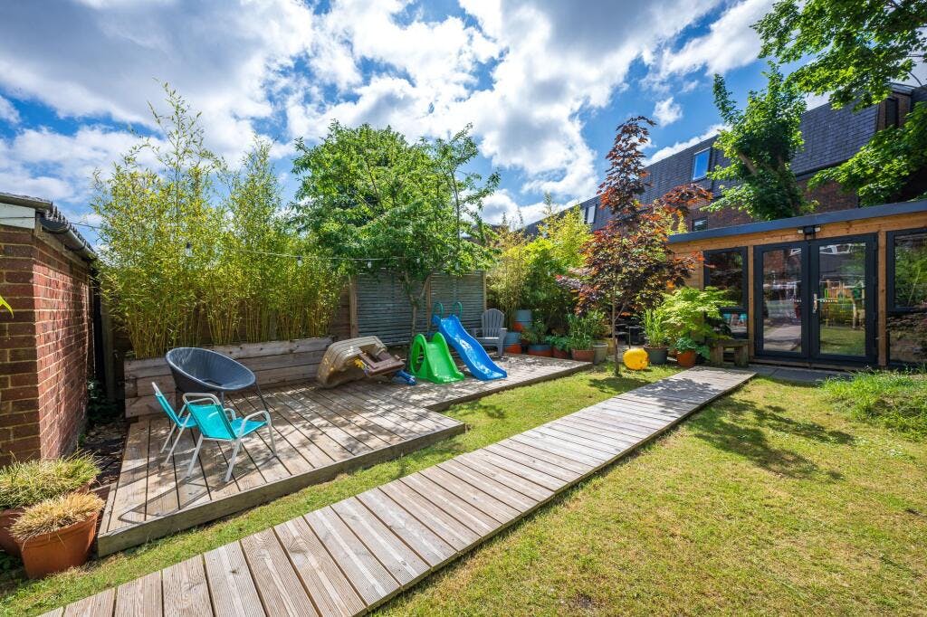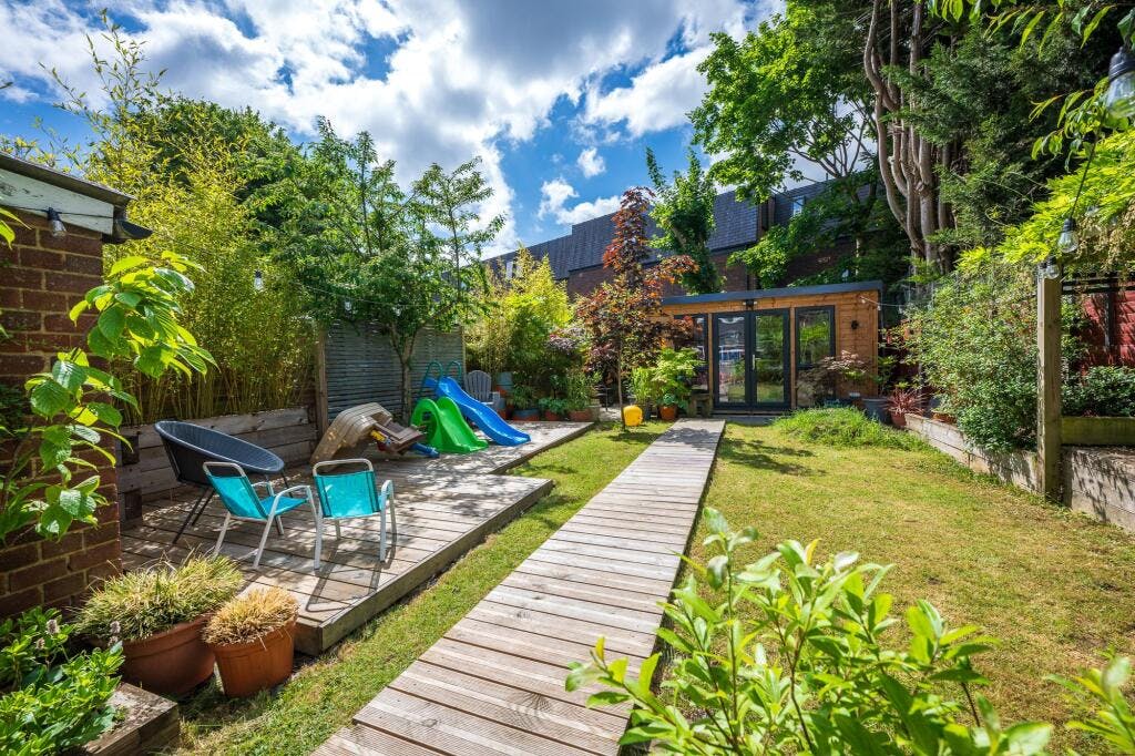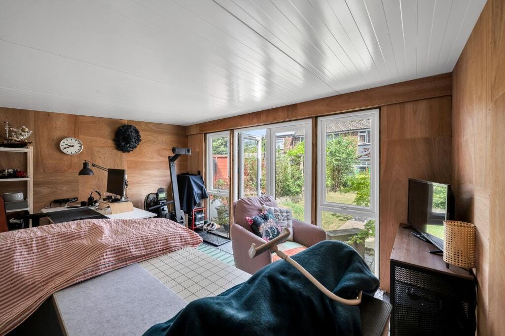 To the first floor, there are three well proportioned bedrooms, plus an elegantly tiled family bathroom with modern white three piece suite. Externally, the garden is laid mainly to lawn, with areas of decking and well stocked borders. An external garden studio/office provides valuable additional family space – ideal for those working from home.