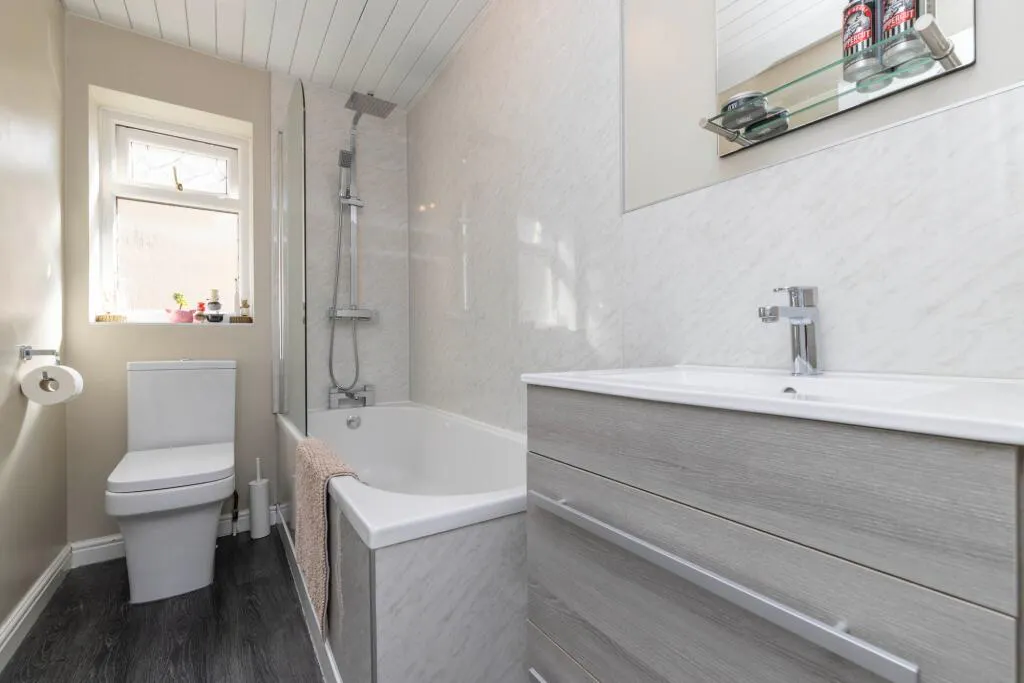 The family bathroom is finished to a high standard, featuring modern fittings and a clean, contemporary design, offering both comfort and practicality