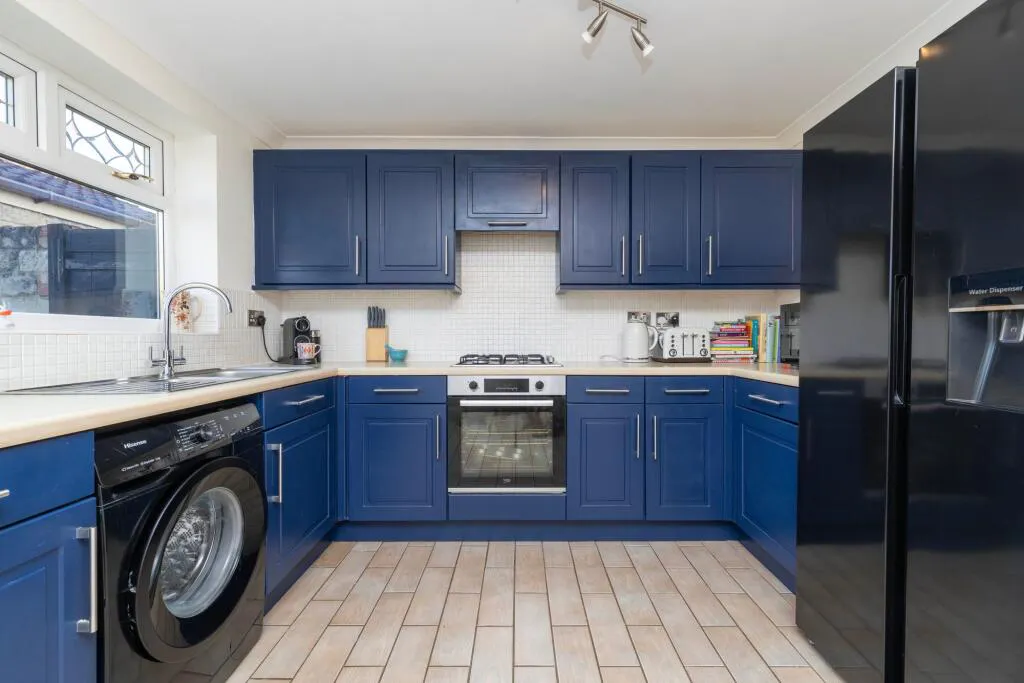 Accessed via a small hallway, the ground floor comprises a spacious and inviting living room, finished in a modern décor that flows seamlessly throughout the home. Crisp white internal doors paired with sleek fittings enhance the clean and contemporary aesthetic. A modern cloakroom affords practicality with modern living. To the rear, the kitchen and dining area provides a functional yet stylish space, offering ample storage and preparation areas. With direct access to the garden, this space is perfect for both family living and hosting guests, creating a natural connection between indoor and outdoor areas.