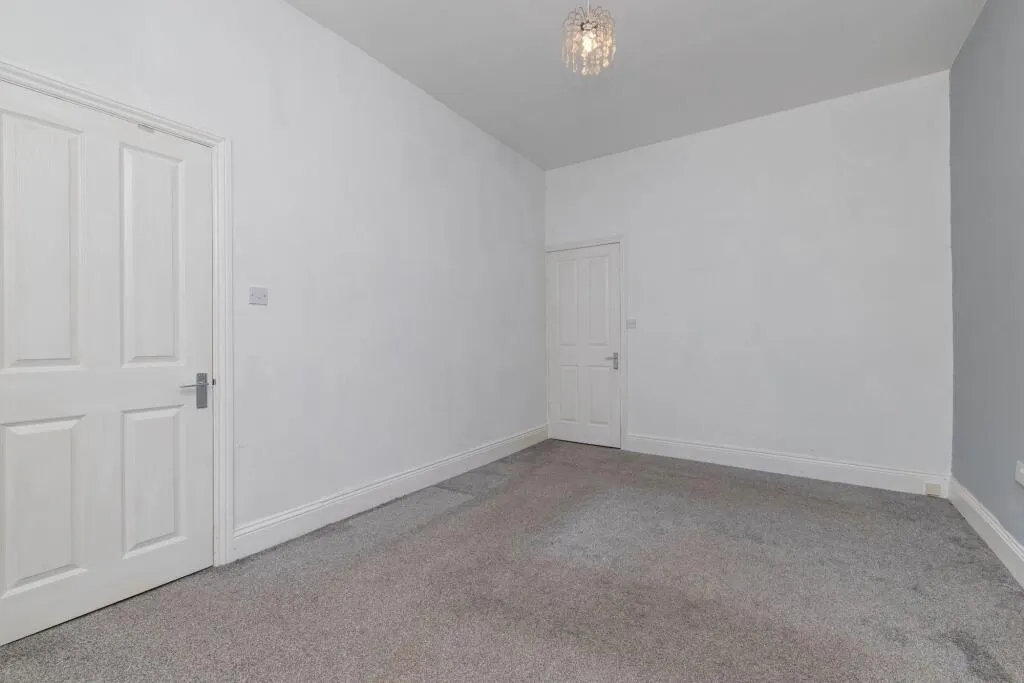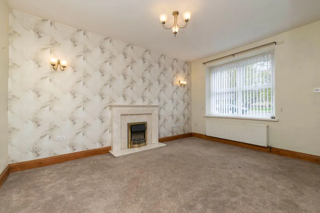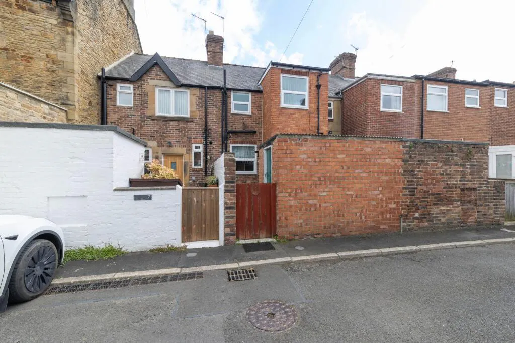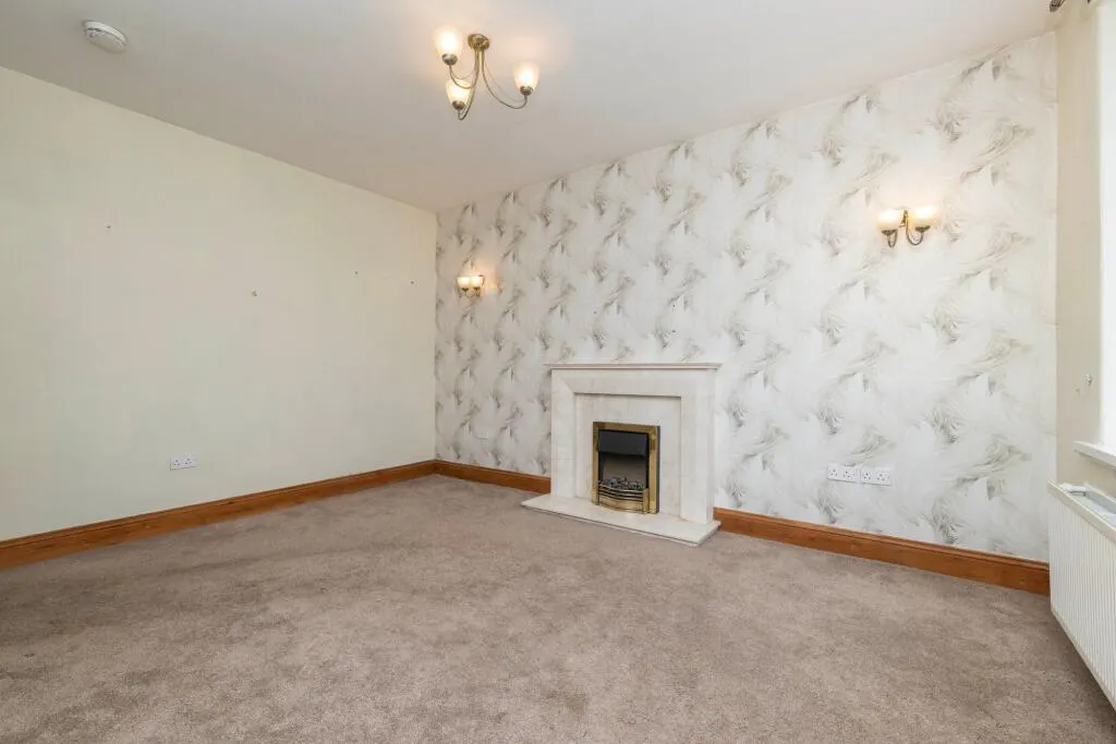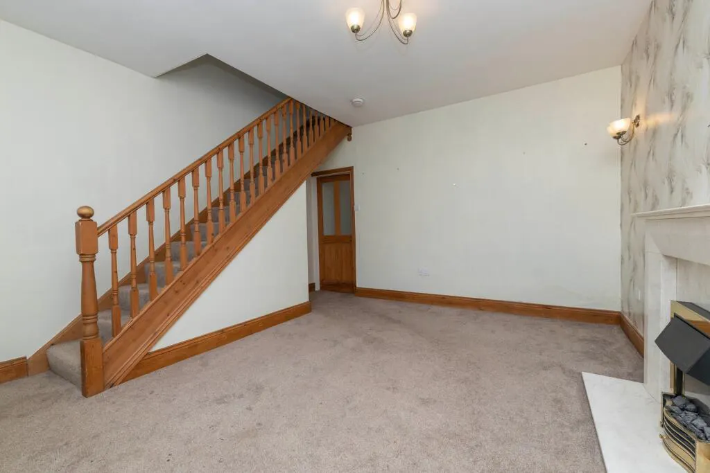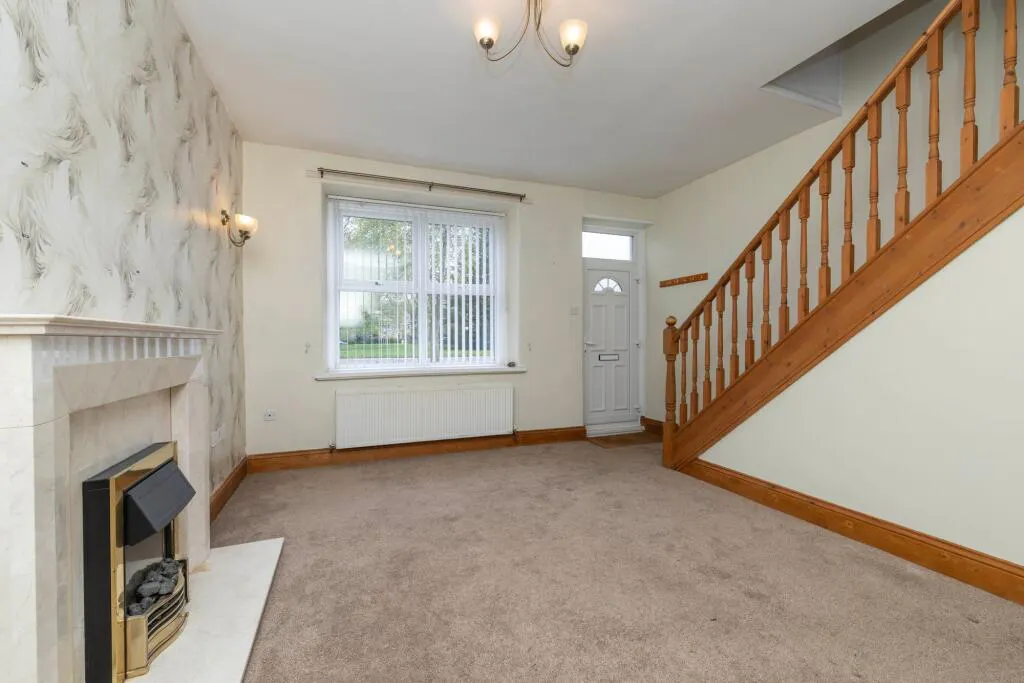This beautifully presented two-bedroom mid-terraced house seamlessly blends traditional charm with stylish modern finishes, making it an exceptional opportunity for those seeking both character and comfort. The property is distinguished by its classic stone facade and period brickwork, complemented by a small, well-maintained front garden enclosed with wrought iron fencing. Entry is via a private wooden gate, creating a sense of security and exclusivity. Inside, the spacious reception room welcomes you with a high ceiling, elegant neutral décor, and plush carpeted flooring, further enhanced by a striking feature fireplace set against decorative wallpaper. A charming wooden staircase, paired with a modern light fixture, adds a classic yet contemporary touch and leads to the upper floor. Natural light floods the living areas through large double-glazed windows, creating a warm and inviting atmosphere throughout the home.