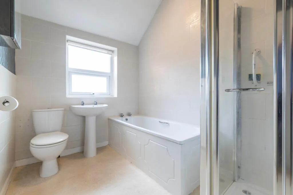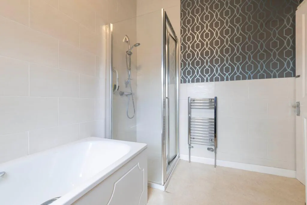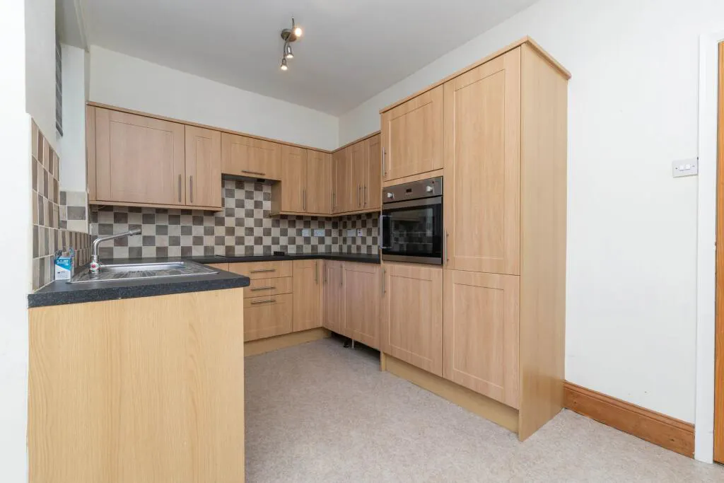 The modern kitchen is thoughtfully designed with sleek wooden cabinetry, ample storage, and a stylish tiled backsplash. Integrated appliances, including a built-in oven, make the space both practical and attractive, while the large window ensures the kitchen remains bright and welcoming. Upstairs, two well-proportioned bedrooms offer built-in storage solutions and plenty of natural light, finished in neutral tones that provide a versatile backdrop for personal touches. The bathroom is a standout feature, showcasing a modern walk-in shower with sleek glass doors, a spacious bath-tub, decorative wall tiling, and a heated towel rail for added comfort. The ample natural light in the bathroom further enhances the sense of space and luxury.