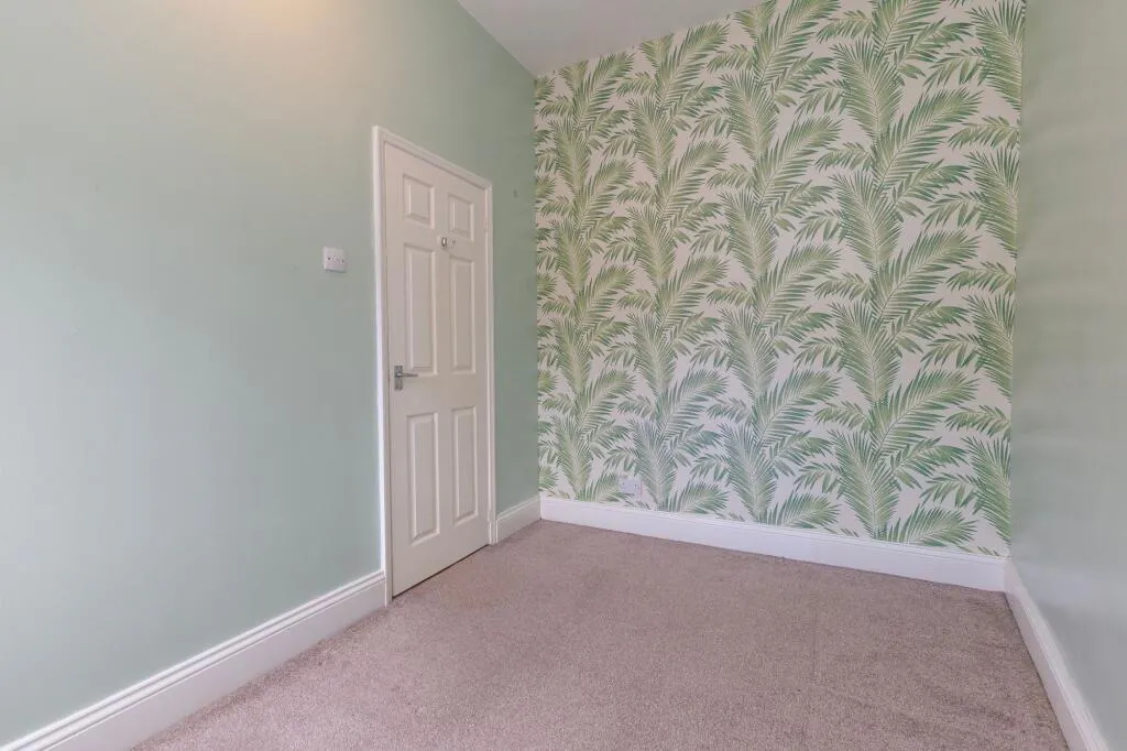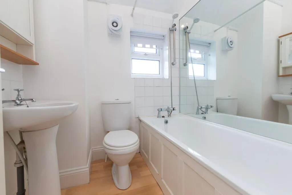 Upstairs, the principal bedroom is a generous double with built in storage, offering plenty of room for furniture and personalisation. The second bedroom is ideal as a guest room, nursery or home office. The bathroom is fitted with a bath and overhead shower, wash basin and WC, with natural light from a frosted window.