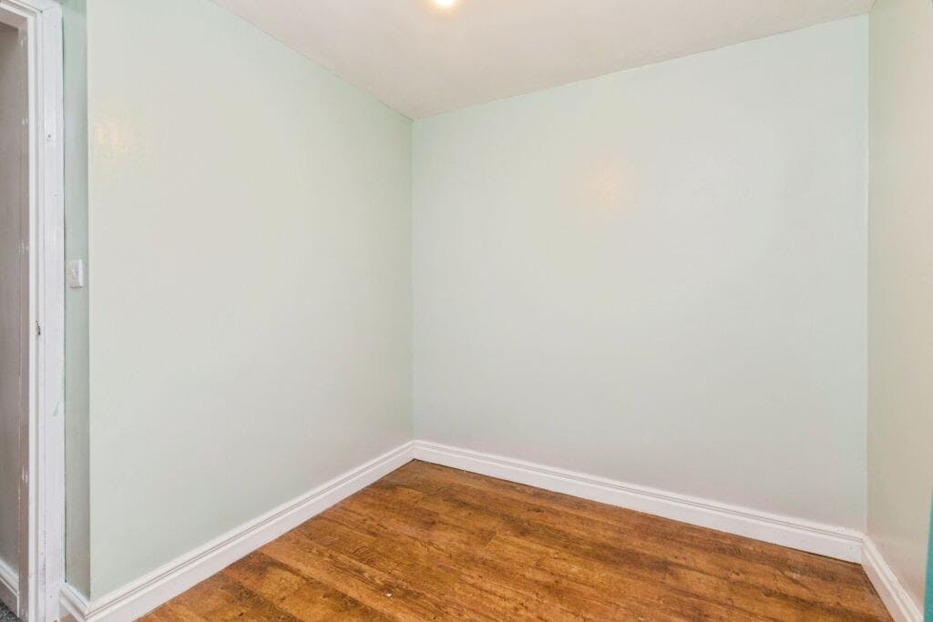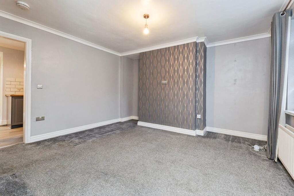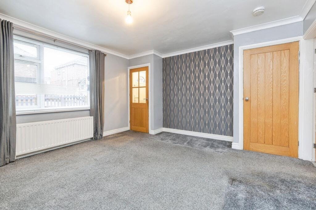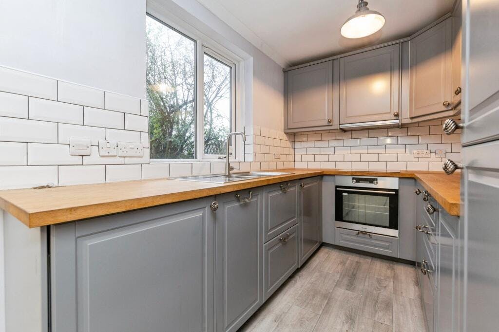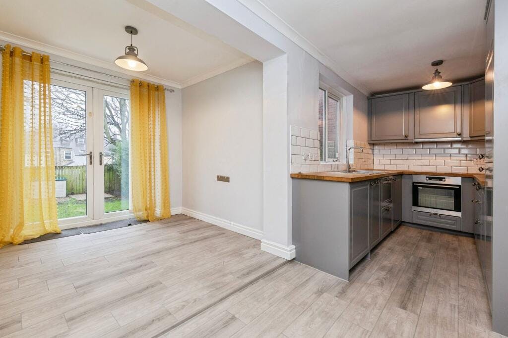 The property’s bathroom is finished to a high standard, featuring modern patterned tiles, a compact vanity unit, and a frosted window for privacy and natural light. Additional highlights include freshly painted neutral walls, contemporary lighting fixtures, and radiator heating to ensure year-round comfort. The layout flows naturally, with a combination of modern flooring and neutral colour palettes, making it easy for new owners to move in and make it their own. The presence of French doors, wooden doors with glass panels, and large feature windows throughout the home further enhance its bright and airy feel.