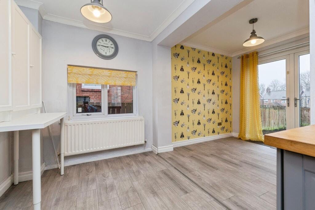 This beautifully presented three-bedroom semi-detached house offers an exceptional blend of modern living and family-friendly features. Upon arrival, the property impresses with its classic brick facade and a charming front garden, enclosed by a colourful picket fence and framed by double-glazed windows. Inside, two spacious reception rooms provide versatile living and entertaining options, each enhanced by large windows that flood the spaces with natural light. The open plan kitchen and dining area is a particular highlight, featuring sleek grey cabinetry, warm wooden countertops, and a stylish white subway tile backsplash. Integrated appliances, including a modern oven, create a seamless cooking experience, while the elegant wooden and tiled flooring throughout adds a touch of sophistication. French doors from the kitchen and living areas open directly onto a generous garden, seamlessly connecting indoor and outdoor spaces and inviting an abundance of light into the heart of the home.