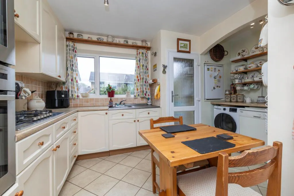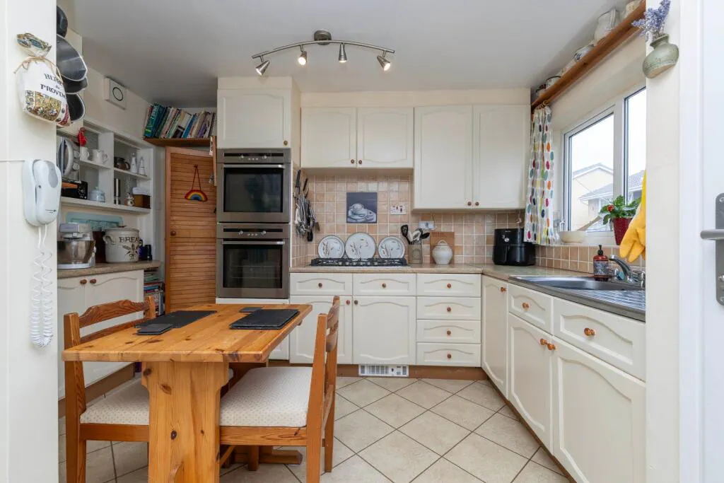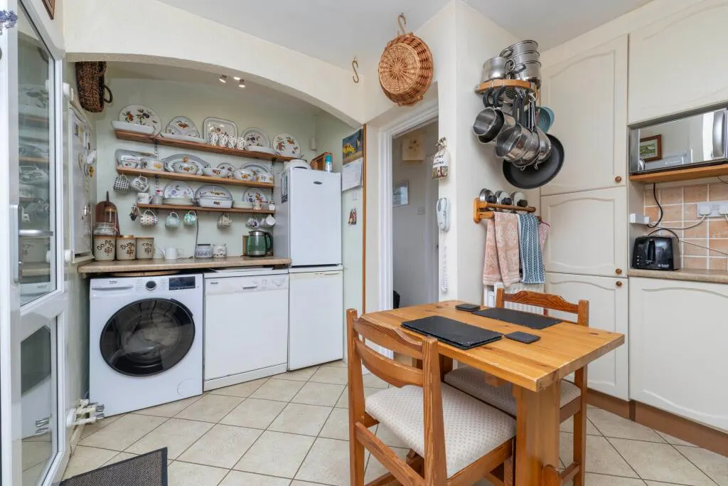 The kitchen offers generous proportions with space for a central breakfast table, tiled flooring, and a traditional wall mounted plate rack. While it would benefit from modernisation, it is fully functional with all appliances in working order, allowing a buyer to update at their own pace.