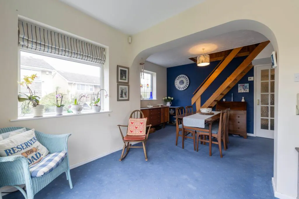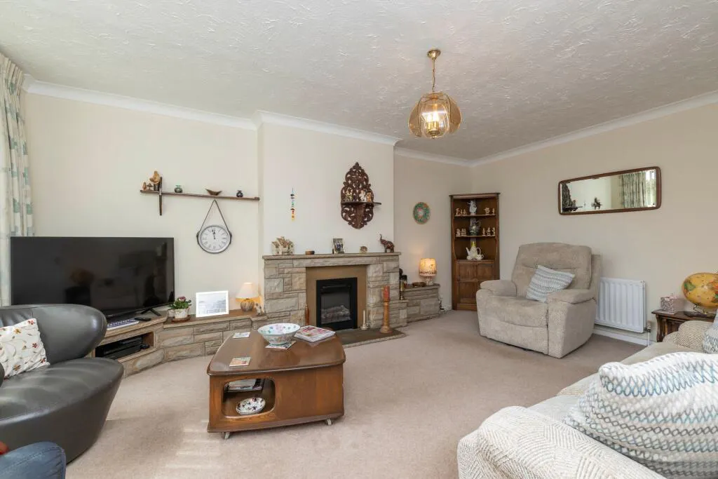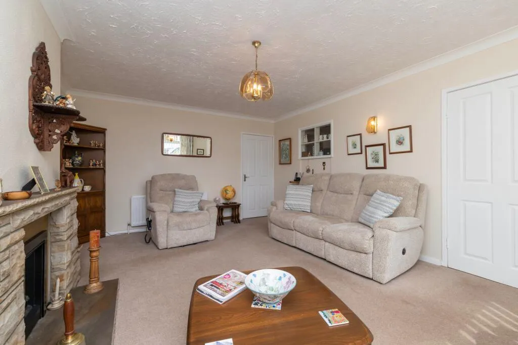 The living room is a standout space, bright and airy thanks to the large front window, and centred around a charming stone built fireplace with integrated television, creating a natural focal point for relaxing evenings.