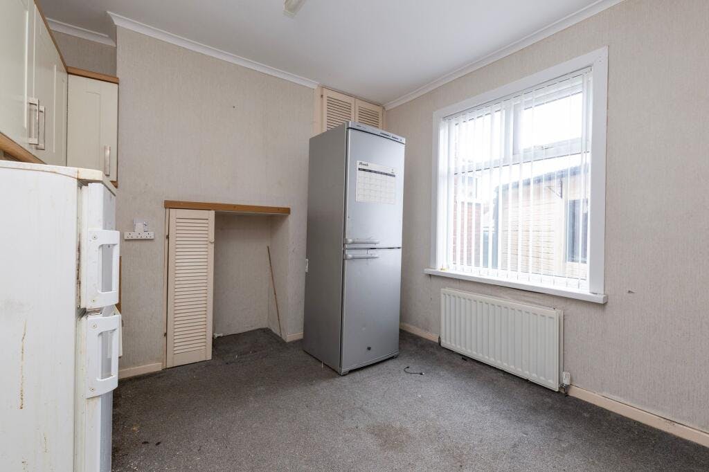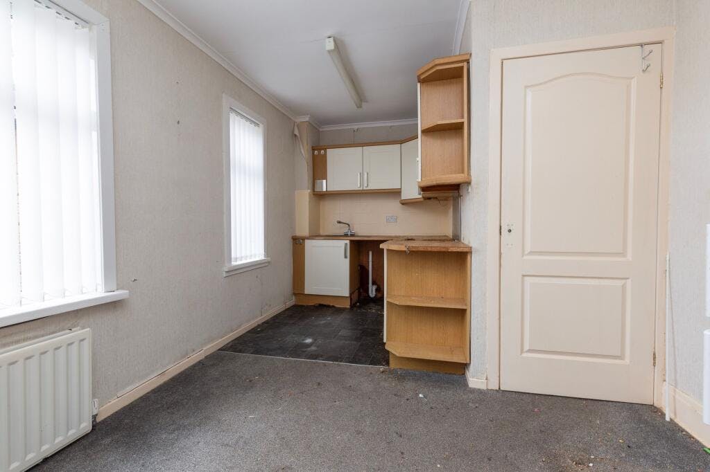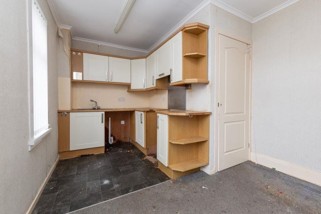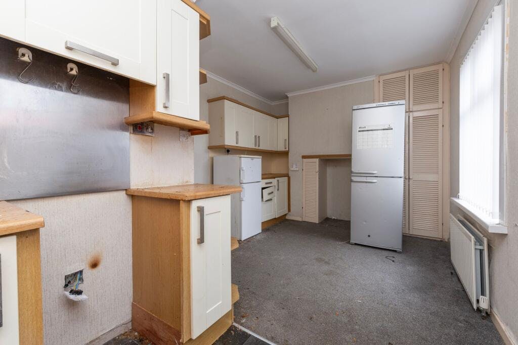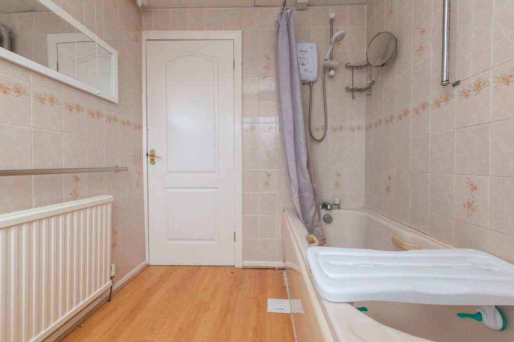 The kitchen is a standout feature, boasting a spacious layout with plenty of cabinets and shelving for storage. Large windows flood the space with natural light, creating a pleasant and practical environment for daily living. The kitchen layout is functional, with both overhead and lower cabinets and room for appliances, while offering scope for modernisation to suit individual tastes. The bathroom is equally appealing, with a classic bath-tub and overhead shower, complemented by floral-patterned tiles and wood-effect flooring for a touch of vintage charm. A large frosted window ensures the space remains bright and welcoming, while practical elements such as a radiator and mirror add to the comfort.