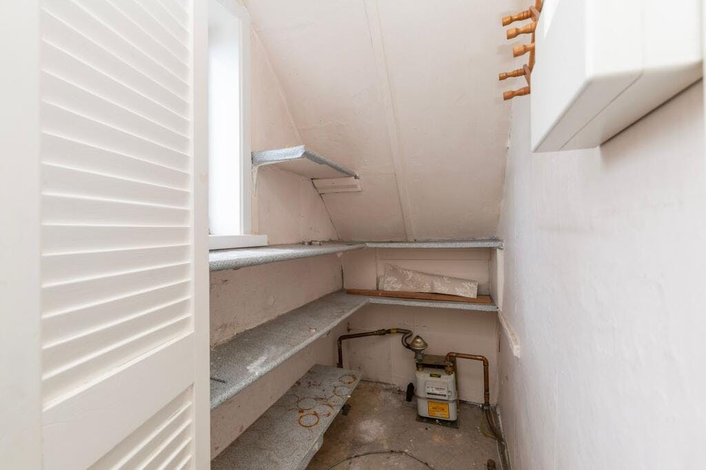Practical utility areas within the home feature built-in shelving and storage under sloped ceilings, maximising available space for household items. Efficient radiator heating snd s single garage ideal for storage, a workshop or car.