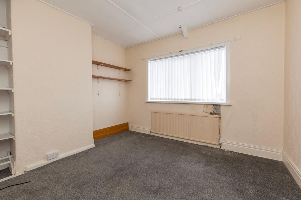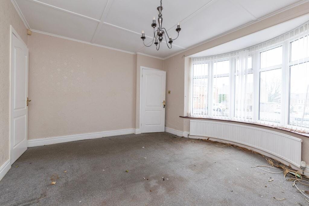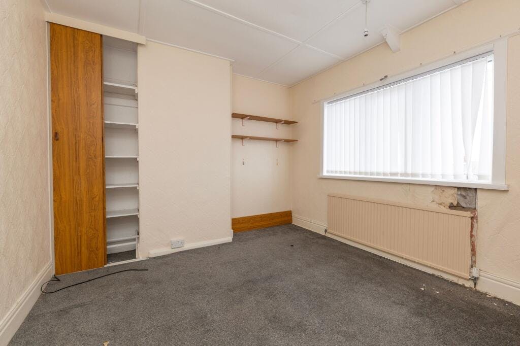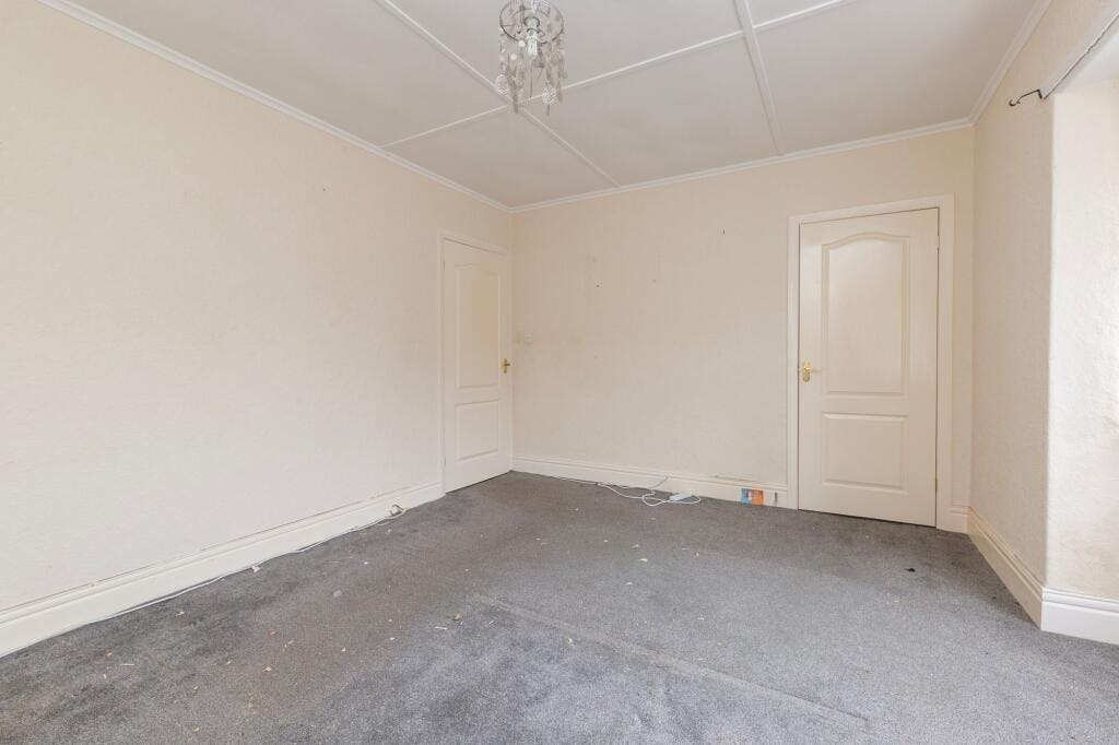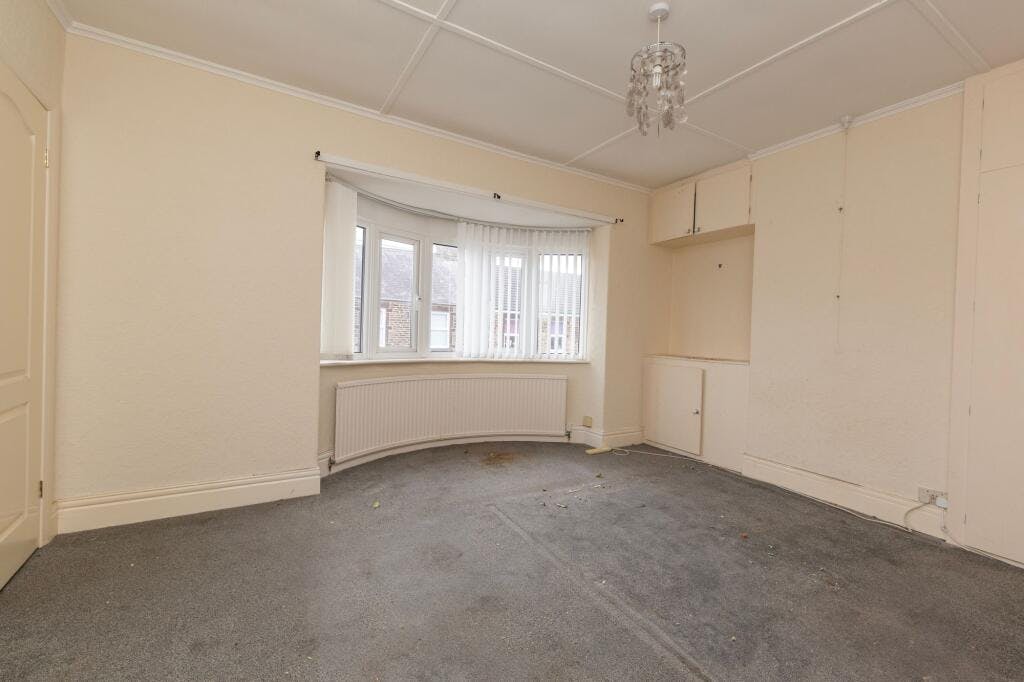 Additional features enhance the property’s appeal further. Throughout the home, built-in shelving and storage cupboards provide practical solutions for organising belongings, while the neutral décor ensures every room can be easily personalised. The main living room features a decorative fireplace and a striking chandelier, creating a cosy and elegant setting for entertaining or unwinding. The large bay windows not only add visual appeal but also maximise the flow of natural light, ensuring every room feels spacious and inviting.