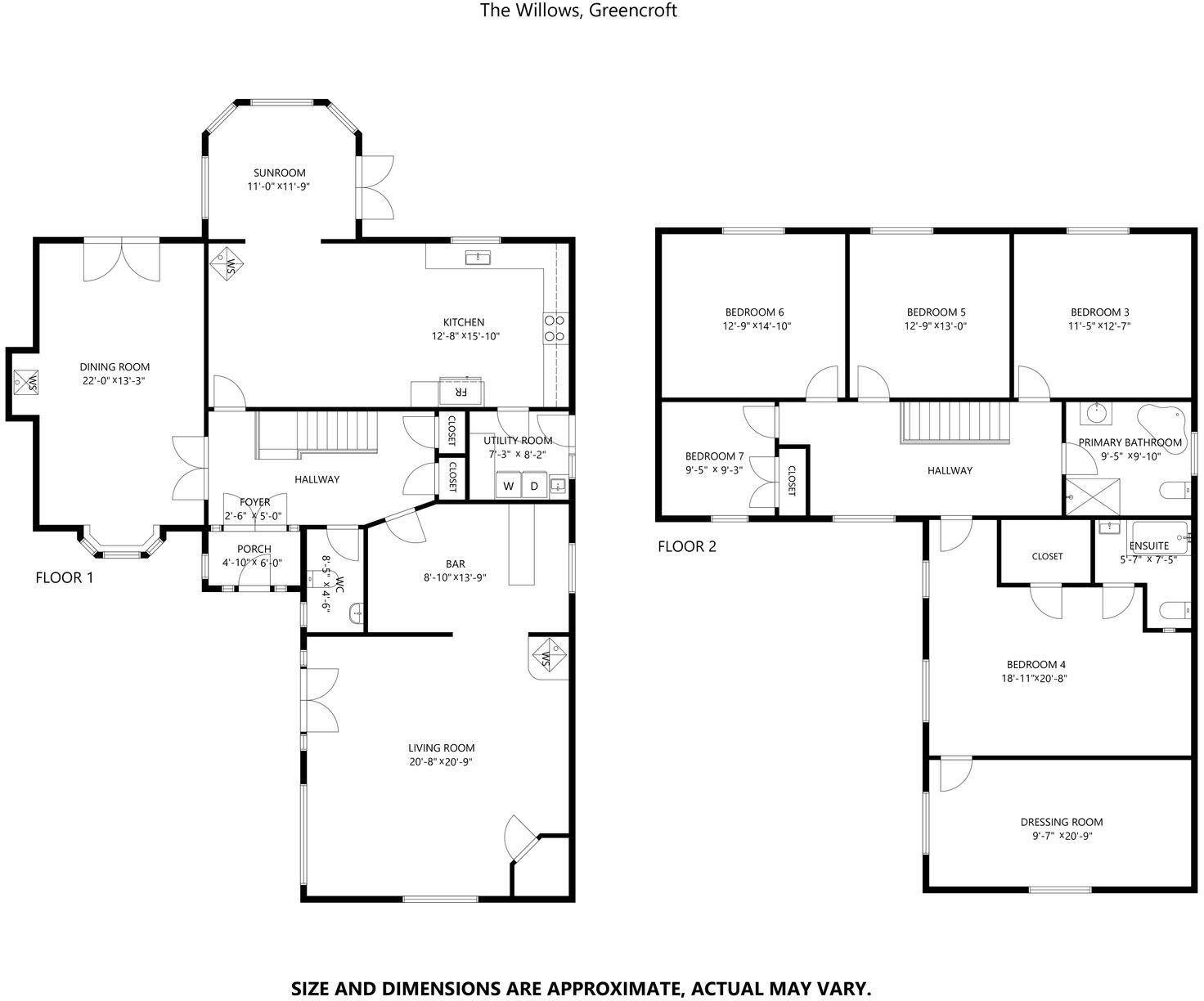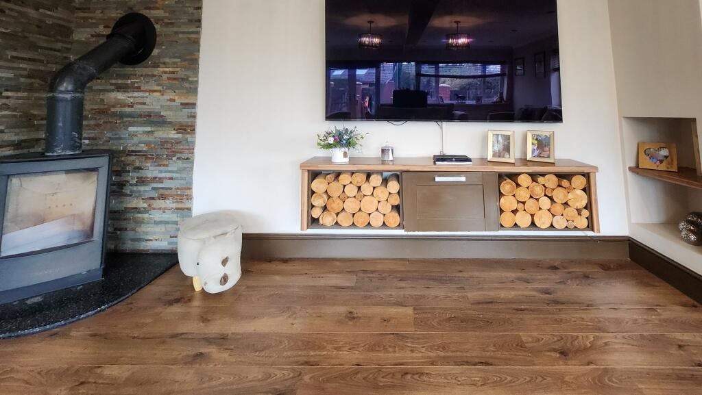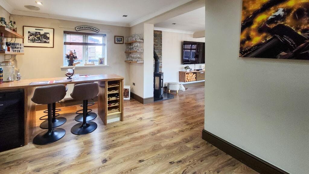 The dining room (21' x 12'4") is a standout space, enjoying dual aspect views with French doors opening to the rear garden. A solid-fuel wood-burning stove creates a striking focal point, while the generous proportions easily accommodate large family gatherings.