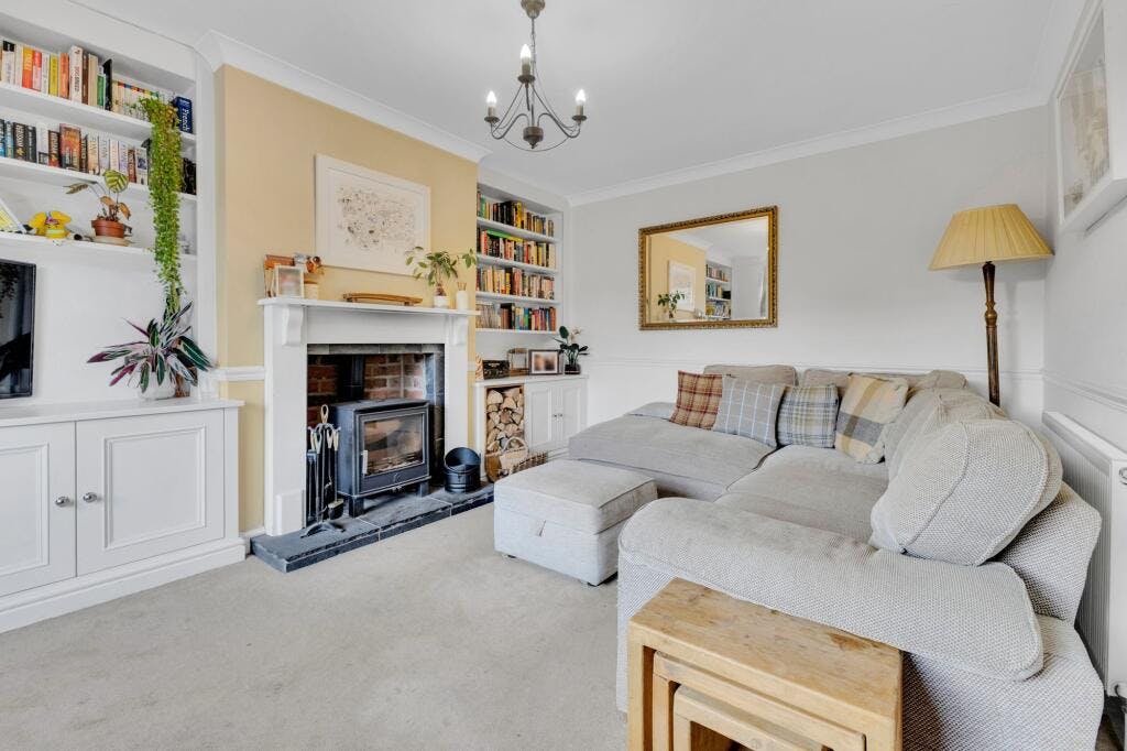 The front lounge has a wood burner, built-in bookshelves and plenty of natural light. At the back of the house, the kitchen and dining area are open-plan and full of style – think Belfast sink, wooden worktops, skylight, and open shelves. It’s got a full-length fridge, integrated dishwasher and a five-ring gas hob, with French doors that open straight onto the garden. Upstairs are three bright bedrooms, all with big windows and a calm, neutral finish. One of the rooms is currently used as a nursery, complete with shutters and built-in shelving. The family bathroom is modern, well-lit and finished with a shower over the bath.