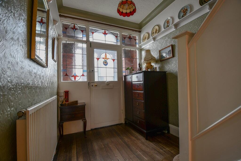 From the moment you step inside, the property showcases a wealth of period features including original wood flooring and beautiful stained-glass windows, creating a timeless feel throughout. The ground floor briefly comprises a welcoming porch entrance, a cosy front lounge with bay window, and a separate dining room enjoying lovely views over the well-kept rear garden. Completing the layout is the kitchen and access to a useful small cellar, ideal for storage.