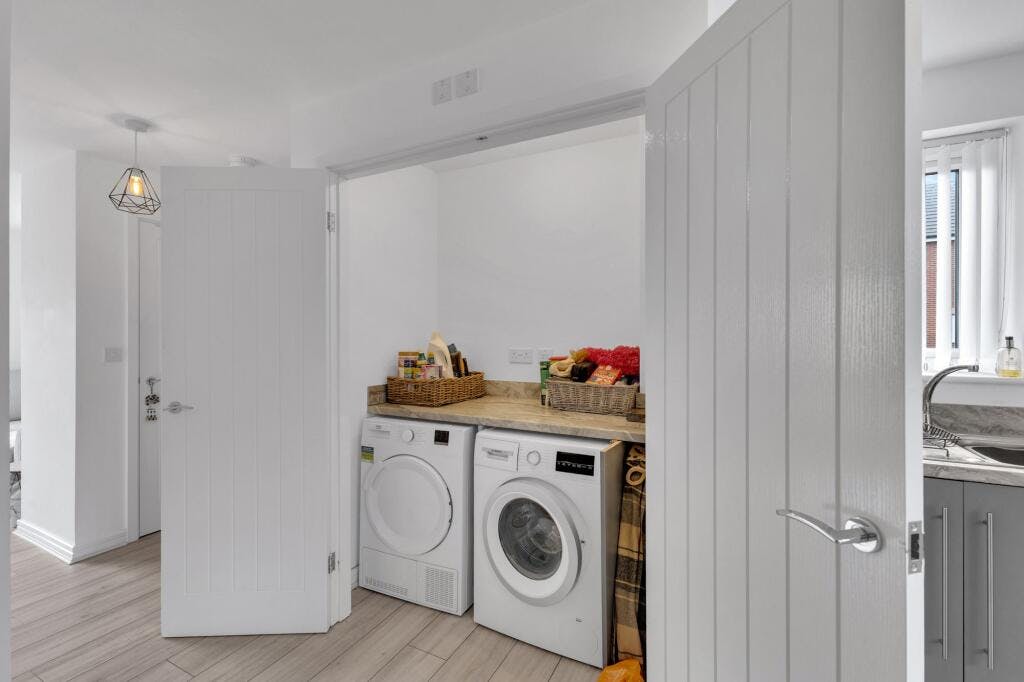 As you arrive, there's off-road parking to the front and a neat lawned area. Step inside and you're greeted by a bright entrance leading to a spacious lounge, perfect for relaxing at the end of the day. The modern open-plan kitchen/diner offers integrated appliances, plenty of cupboard space. A separate utility space and a handy downstairs WC complete the ground floor.