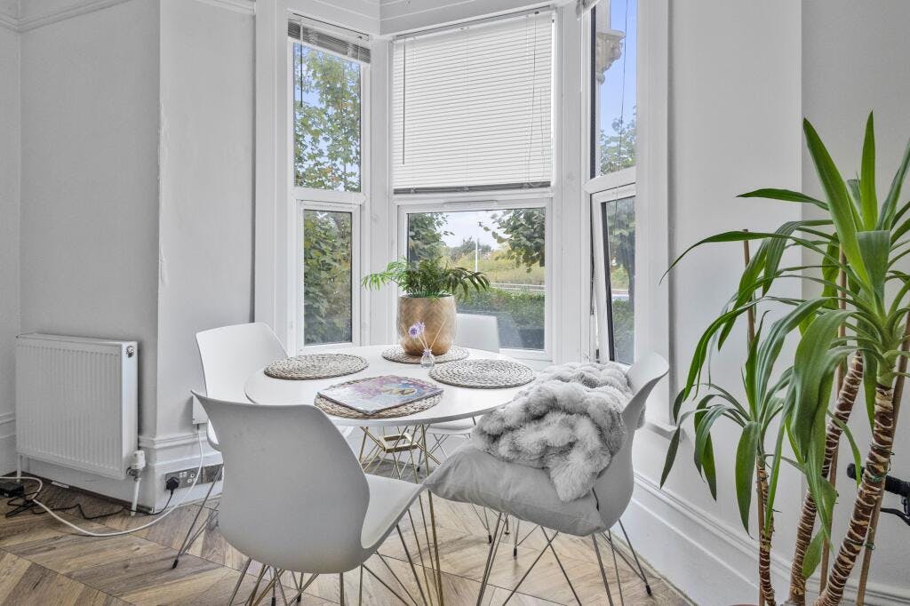 Sunlight spills through the graceful bay-window in the living/dining room, casting a soft glow across high ceilings, period mouldings and those pleasing proportions that elevate everyday living. The separate fitted kitchen offers tasteful modern finishes, clean work surfaces and all the essentials for everyday cooking and entertaining. A peaceful double bedroom sits quietly away from the street, offering restful nights and a calm retreat. The bathroom has been tastefully completed with contemporary fixtures and warm-tone tiling, marrying functionality with style.