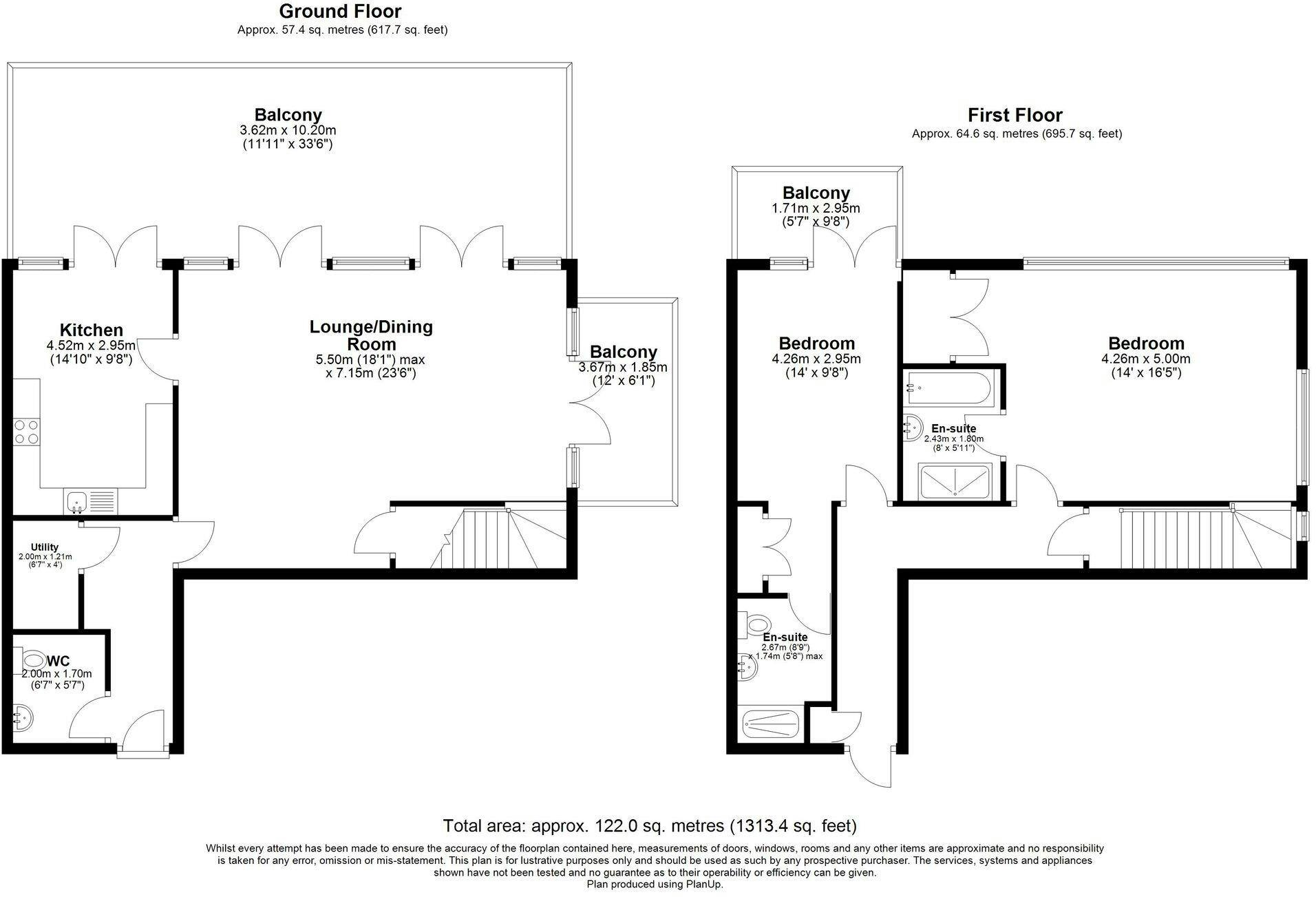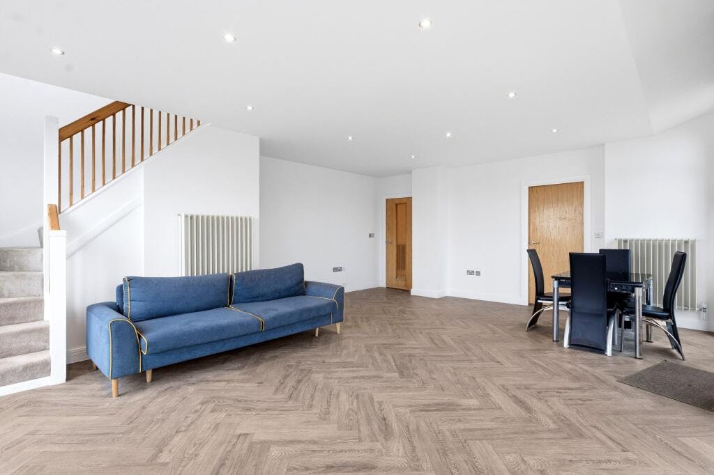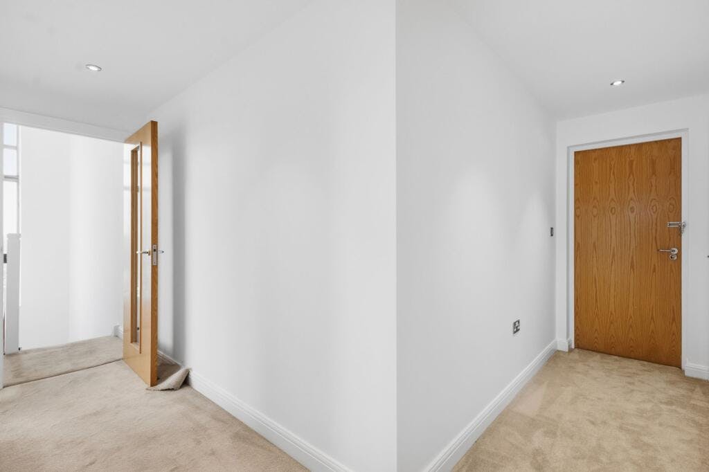 Upstairs, the first floor hosts two well proportioned double bedrooms. The principal bedroom is particularly impressive, featuring built in storage, a private ensuite bathroom and access to its own balcony. The second bedroom is also a generous double with its own ensuite, making it ideal for guests or sharers. A third balcony enhances the upper level, providing additional outdoor space and dual aspect views.